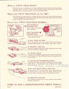 You have found the missing piece to your car collection! Here is a Brochure or Pamphlet featuring Twin Traction. It is a Fold Up Single Page, that is 8 1/2" by 5 1/2" that folds up to 8 1/2" by 11". Excellent preowned condition, by does have a Dealer Stamp on the Cover. Please see our Not Just China Store for more of this collection.