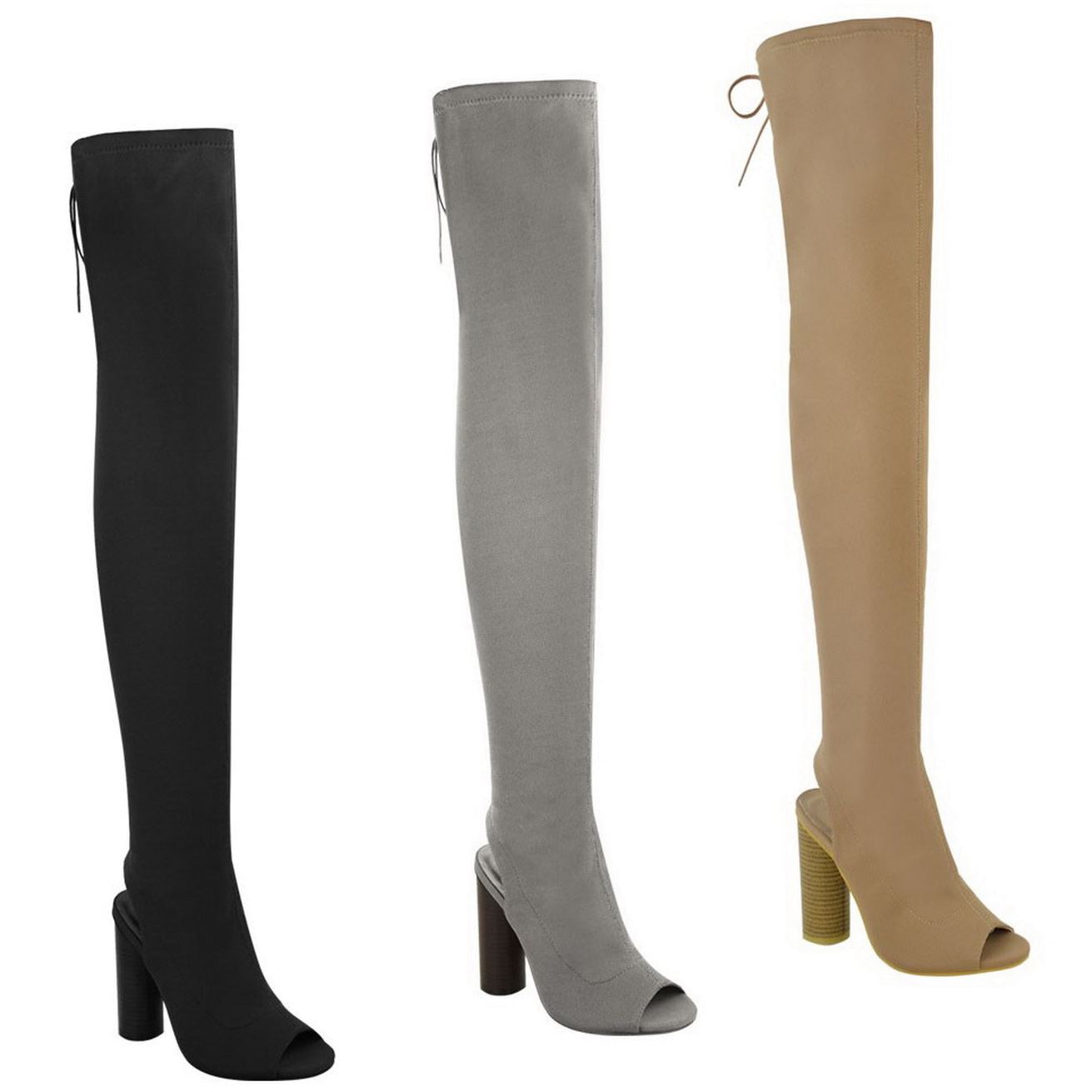 LADIES WOMENS THIGH HIGH OVER THE KNEE KNIT STRETCH BOOTS BLOCK HEEL SHOES SIZE