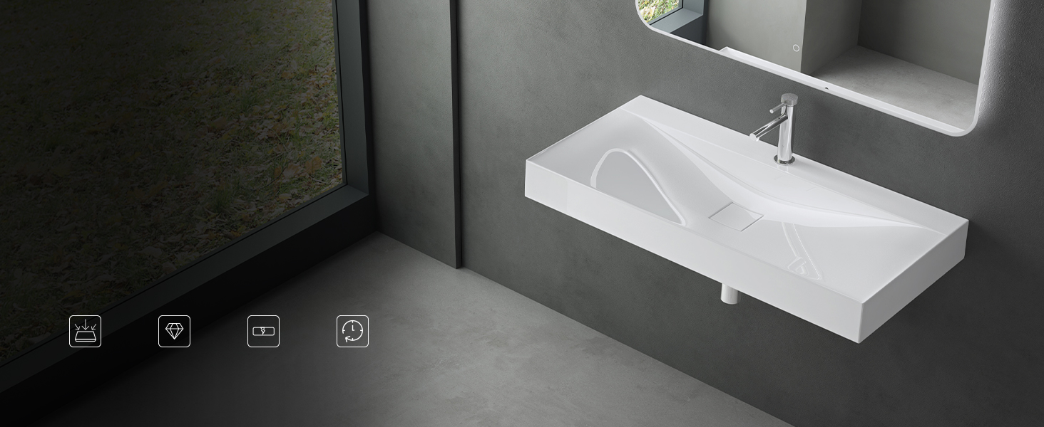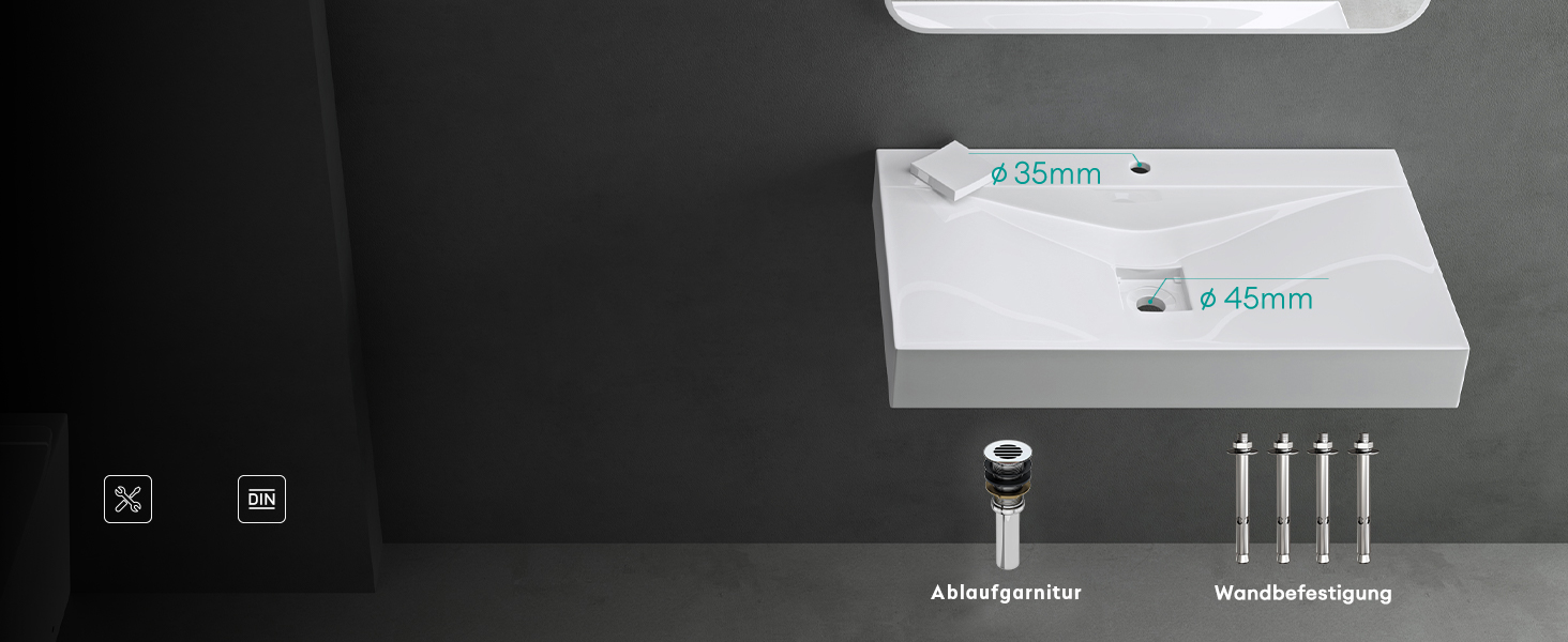 Im Lieferumfang enthalten sind ein durchlässiger Abfluss und vier Dübel-Schrauben. Das Waschbecken entspricht strikt dem deutschen Industriestandard DIN, erfordert keine speziellen Werkzeuge oder Fachkenntnisse und reduziert so die Installationsschwierigkeit und -kosten.