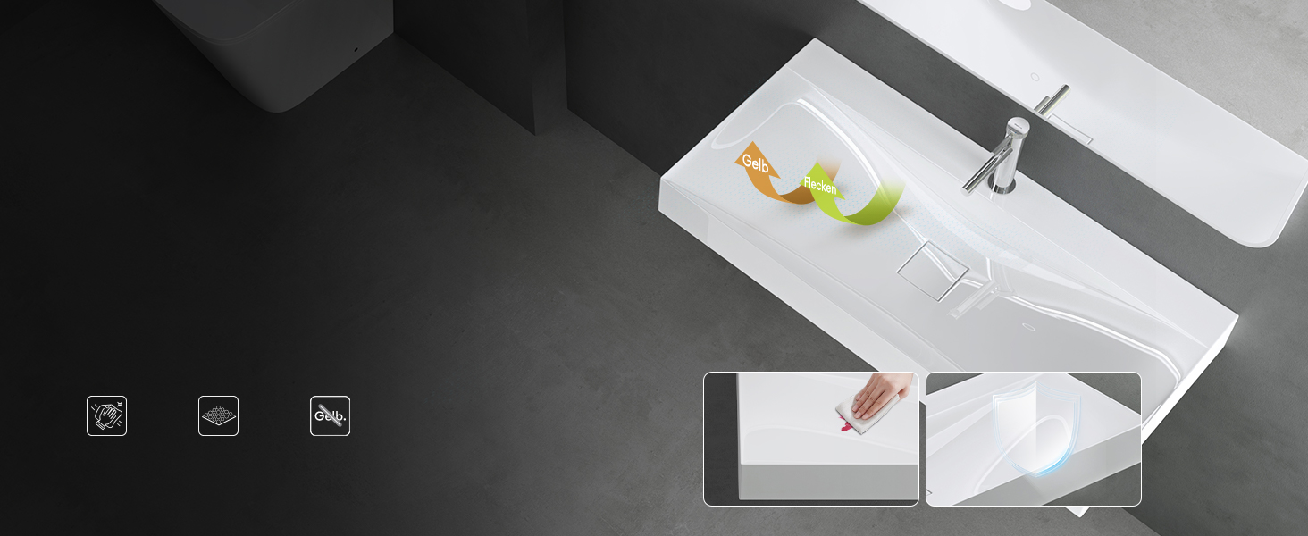 Das Design der Waschbeckenoberfläche ist einfach zu reinigen und zu pflegen. Die verbesserte Gelcoat-Schicht / Nanoversiegelung schützt effektiv vor Vergilbung und Verfärbung und verbessert die Schmutzabweisung, was die Reinigung und Wartung erleichtert.