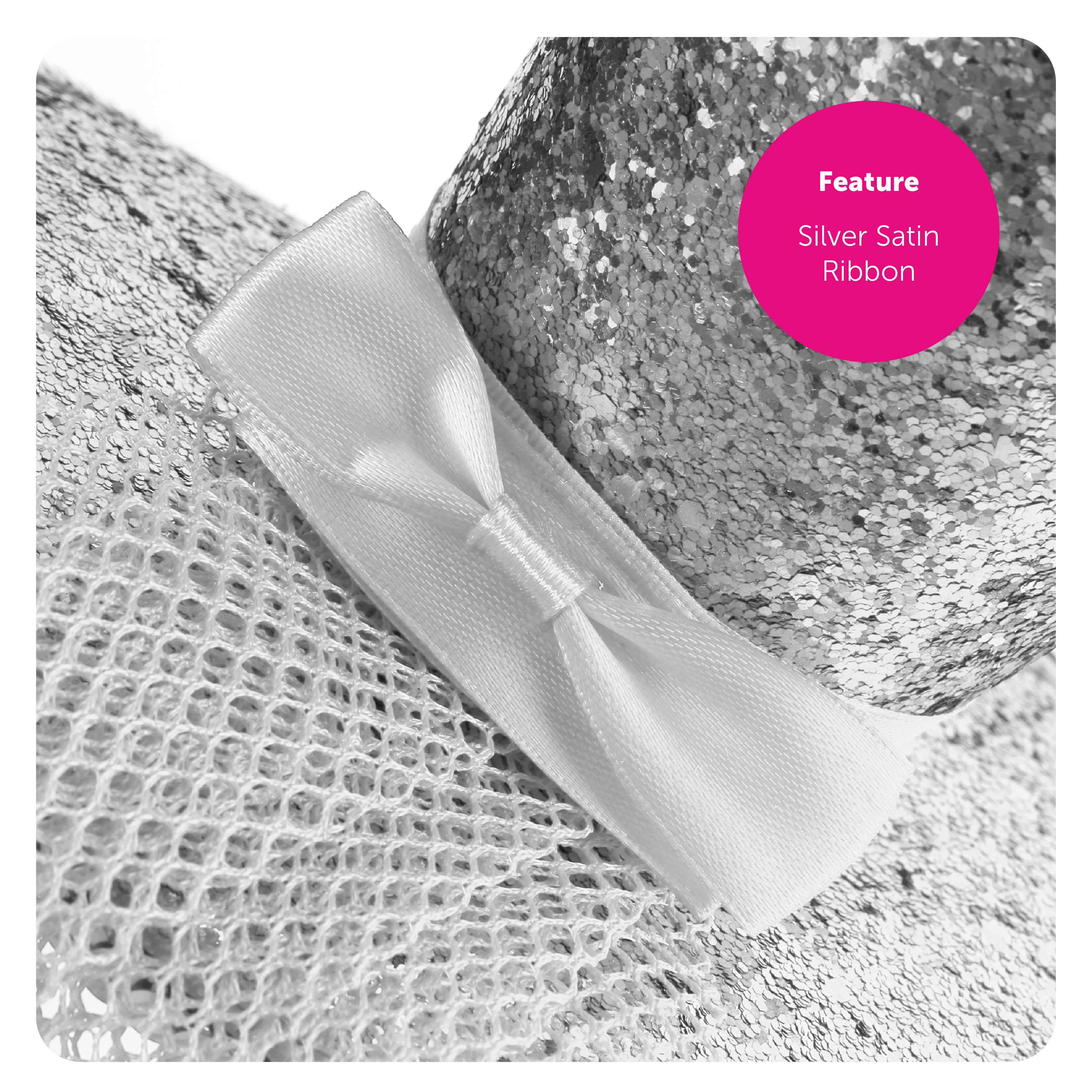 GREAT QUALITY AND FEATURES: A brilliant hat with a lot of intricate details, from the Glitter decorating the hat, the Silver ribbon adding the extra flash to the top, followed by a gorgeous Silver net to veil your face, it all comes together nicely!