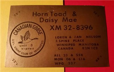 WOW! ........... RARE VINTAGE "HAM CB CITITZENS BAND BASE STATION SHORT WAVE RADIO QSL TRADING CARD * HORN TOAD & DAISEY MAE - LOREN & JAN NELSON - GRAPHICS ART : CANADIAN GOOSE - WINNIPEG CANADA" - VERY UNIQUE ITEM * JUST IN! (great find!) additional auctions ship for free! Buy more - save More ......