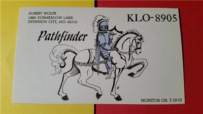 WOW! ........... RARE VINTAGE "HAM CB CITITZENS BAND BASE STATION SHORT WAVE RADIO QSL TRADING CARD * PATHFINDER - HUBERT WOLFE - GRAPHICS ART : KNIGHT READY FOR BATTLE - JEFFERSON CITY MO MISSOURI" - VERY UNIQUE ITEM * JUST IN! (great find!) additional auctions ship for free! Buy more - save More ......