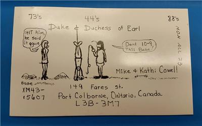 WOW! ........... RARE VINTAGE "HAM CB CITITZENS BAND BASE STATION SHORT WAVE RADIO QSL TRADING CARD * DUKE & DUTCHESS of EARL - MIKE & CATHI COWELL - GRAPHICS ART : TORCHER - PORT CALBORNE ONTARIO CANADA" - VERY UNIQUE ITEM * JUST IN! (great find!) additional auctions ship for free! Buy more - save More ......