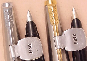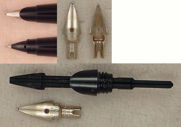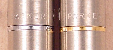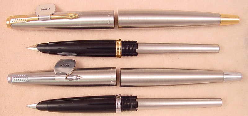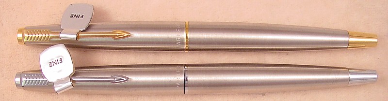The pen w/ nickel trim has a smooth Fine Parker Octanium nib while the pen with gold-filled trim has a smooth Fine Parker 10k Gold nib.