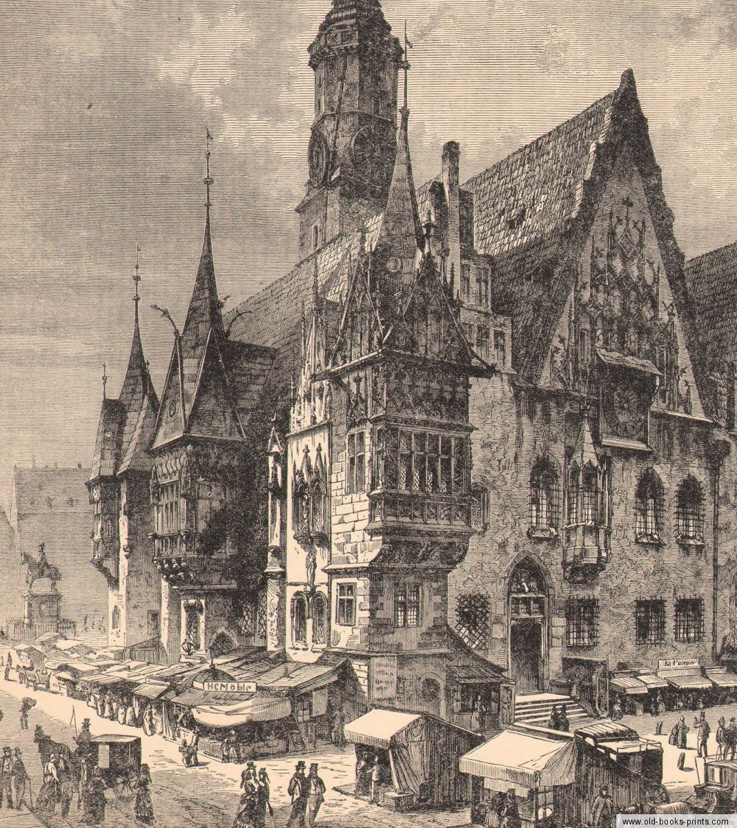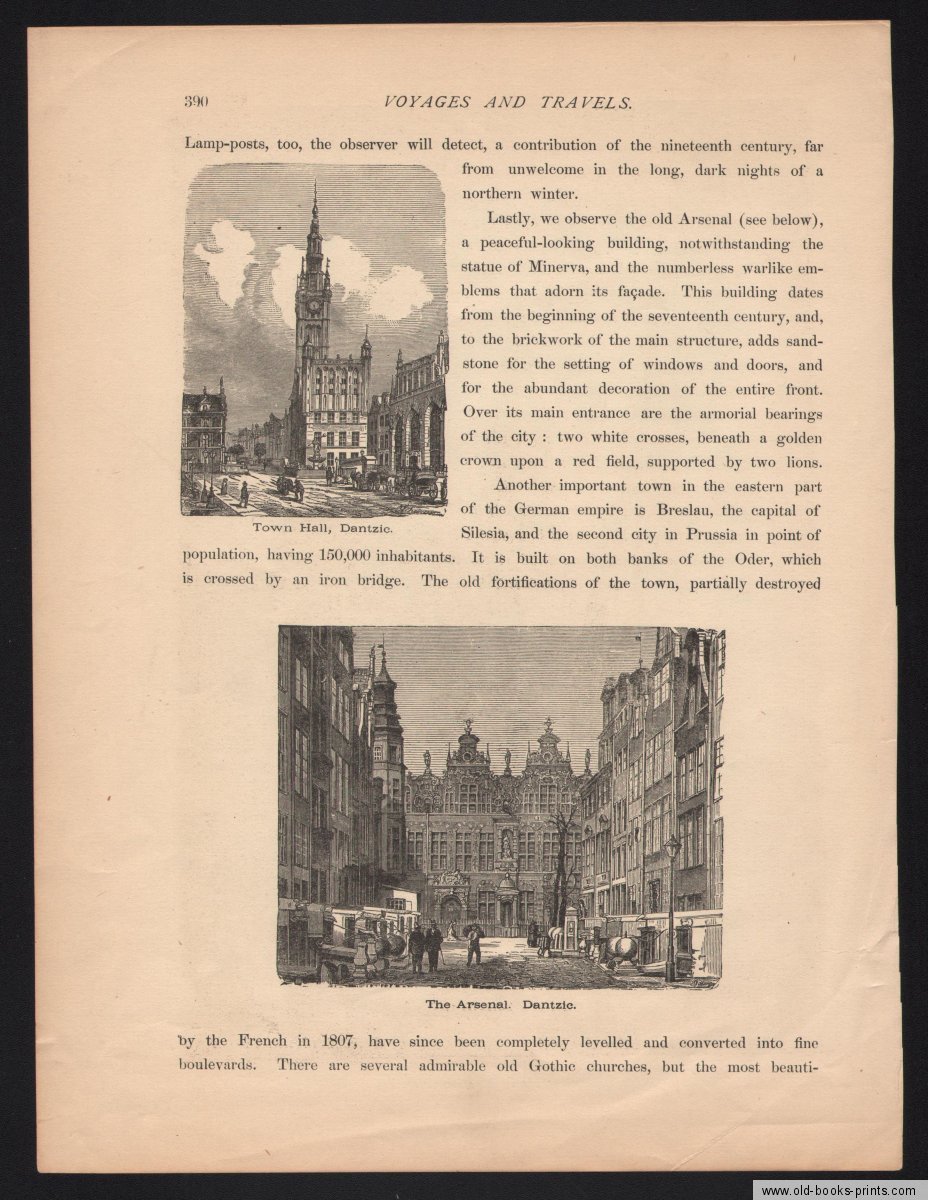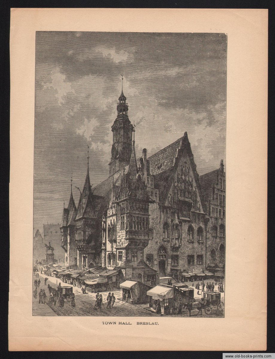 Eine Ansicht des Rathauses in Breslau, Original-Holzstich aus "Voyages and Travels", um 1880. Bildgrösse: 25 x 16,9 cm, Blattgrösse: 30,3 x 22,9 cm. Betitelt: "Town Hall. Breslau.". Rückseitig englischer Text und zwei Holzstichansichten von Danzig. Eine Ecke etwas knittrig, gering gebräunt, sonst noch recht gut erhalten. Schönes Blatt, lebendige Darstellung mit reicher Figurenstaffage und Markttreiben auf den Vorplätzen. Dekorative Ansicht! Original, kein Nachdruck, für die Echtheit wird garantiert!!