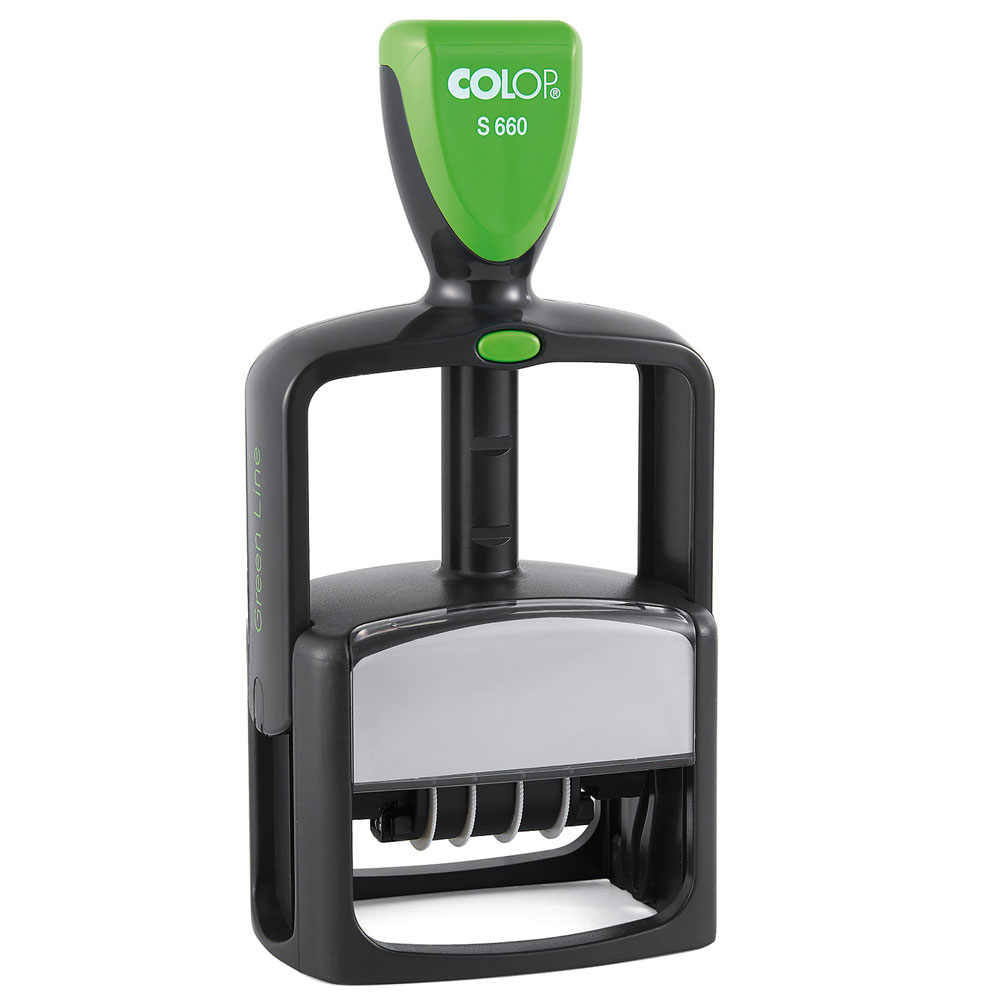 Der Colop S660 GreenLine Datumsstempel bietet sowhl im gewerblichen als auch privaten Rahmen die Möglichkeit Unterlagen und Dokumente mit personalisierten Stempelabdrucken und konfigurierbaren Datum zu versehen.