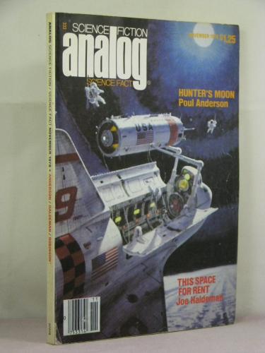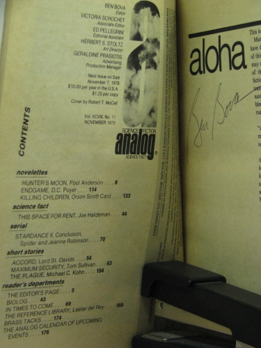 Description: A digest size magazine with cover date of November 1978. Until 1960 this magazine was Astounding Science Fiction. Stories by some of the best of the magazine authors. Signed by editor Ben Bova on the editorial page without inscription or personalization. Signed by story authors Spider and Jeanne Robinson (personalized), Poul Anderson (personalized), Joe Haldeman, and Orson Scott Card on the first or second page of their stories. Two stories signed by illustrator Doug Beekman without inscription or personalization.