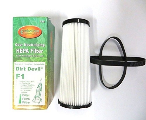 Size:F1 Filter & 2 Belts (2) Dirt Devil Style 4/5 Belts fits all Featherlite Uprights that use paper bags, all Swivel Glide Uprights that use paper bags, and all Dirt Devil Vision Uprights. Replace your belts every 3 to 6 months. (1) F1 HEPA FILTER Designed to Fit Dirt Devil Part Number F1, 23JC0280000 & 3JC0280000 Fits the following models: Scorpion, Bagless Extra Light, Breeze Bagless, Jaguar Bagless, Scorpion Deluxe Bagless, Featherlite Bagless, Vision Bagless (does not fit original Vision Bagless produced before 2003), Platinum Force Vision
