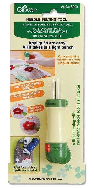 The Clover Needle Felting Tool can be used for flat, sculptural and appliqué work. It cleverly interlaces the fibres of a felt/wool appliqué and base fabric to create a beautiful finished motif.