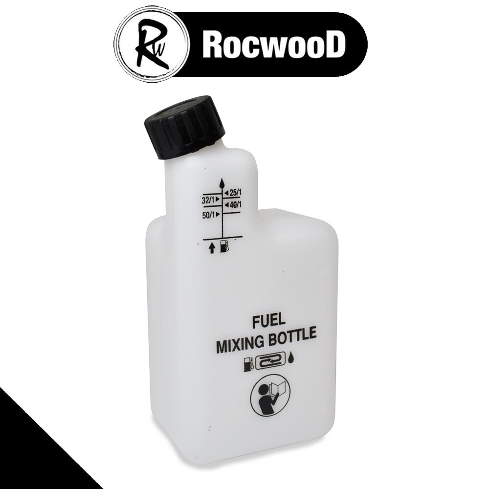 It is a fact that petrol will go stale and by using stale petrol your machine will not perform properly, also two stroke oil will seperate from petrol after a period of time and this will increase the risk of your engine parts seizing due to lack off lubrication. This bottle enables you to mix as little as approximately one litre of fuel with the correct ratio. The bottle markings enable an accurate mix for 25:1, 32:1, 40:1 and 50:1 ratios. Simply fill with petrol (1 litre) to the mark and then add the two stroke oil to the mark with the required mix, replace the cap and then shake gently.