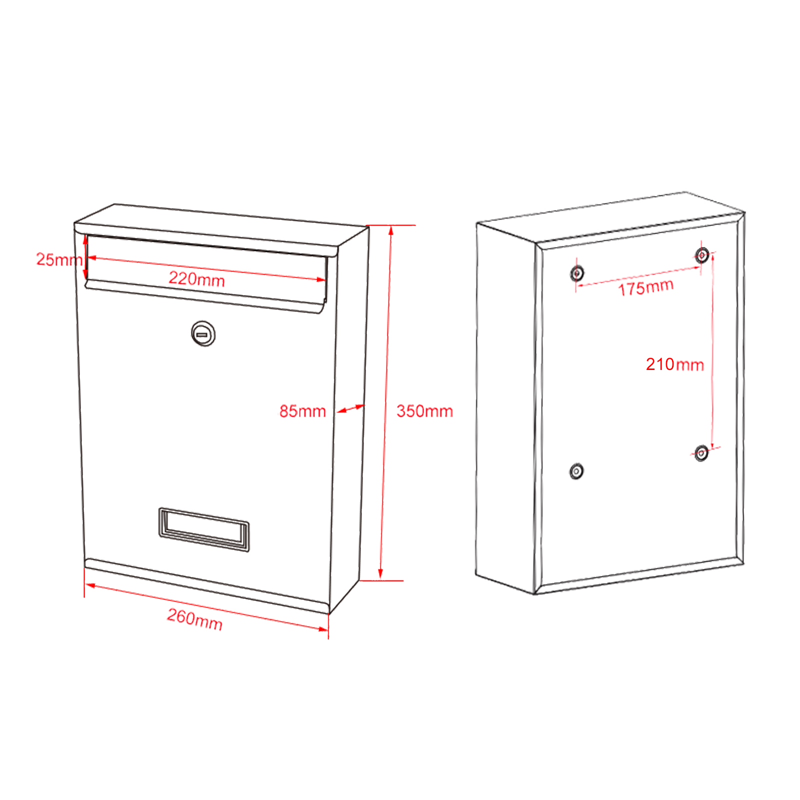 | Dimensions | boîte aux lettres: 26 x 8,5 x 35 cm fente à lettre: 22 x 2,5 cm |