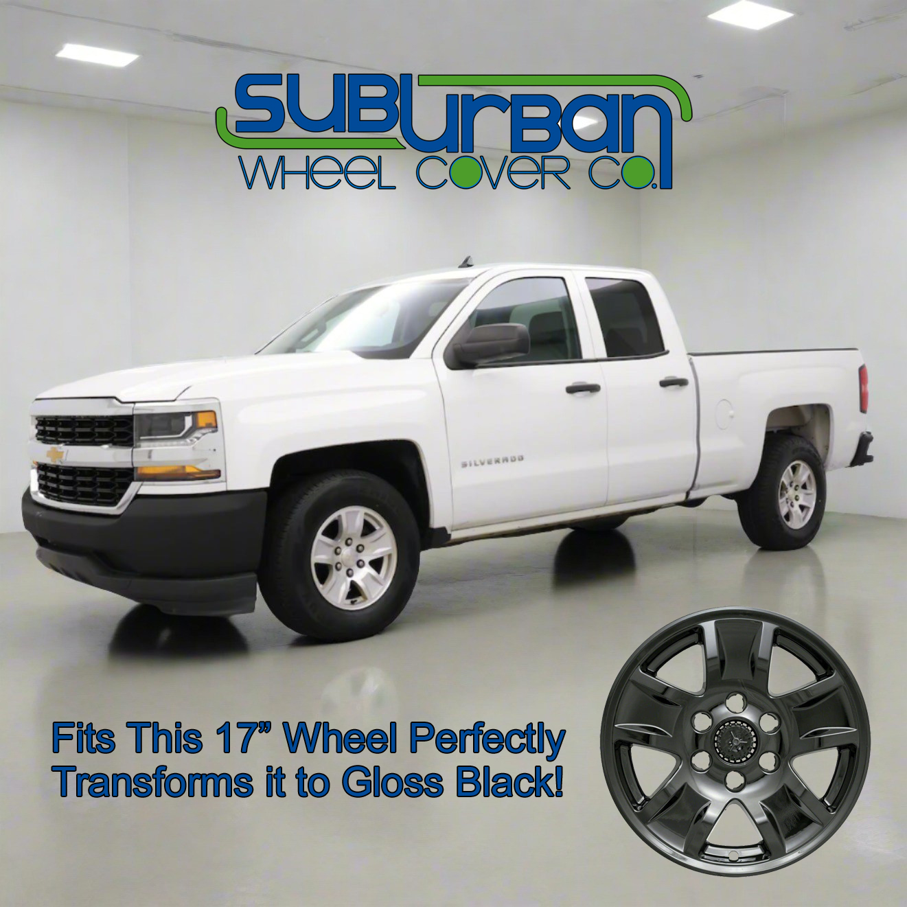 This listing is for a brand new set of (4) gloss black wheel skins for the 2014-2019 Chevrolet Silverado 1500 with the matching 17" 5 spoke aluminum wheel only (see truck photo). The center cap shown is not included. They should already be on your vehicle.
