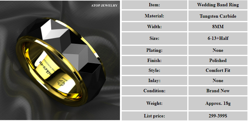 8Mm Black Rhombus high polished Tungsten ring 18k Gold wedding band ATOP jewelry