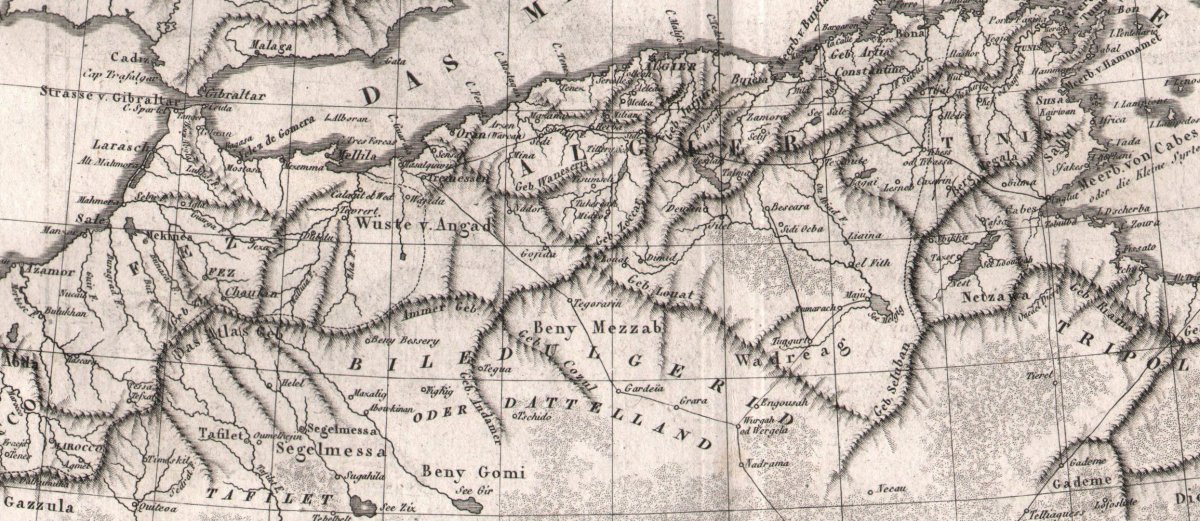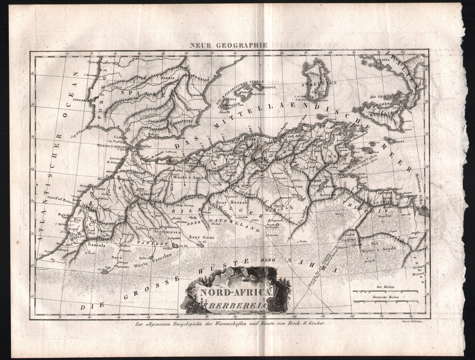 Eine Landkarte von Nordafrika, Original-Kupferstich nach Schlieben aus der "Enzyklopädie der Wissenschaften und Künste" von Ersch und Gruber, die 1818 - 1869 erschien. Kartengrösse (ohne Schrift oben und unten): 19,4 x 28,8 cm, Blattgrösse: 25,5 x 32,8 cm. Mittelfalte wie üblich, etwas Druckfarbenabklatsch, sonst kaum fleckiges, sehr gut erhaltenes Exemplar. Schöne, dekorative Karte. Original, kein Nachdruck, für die Echtheit wird garantiert!