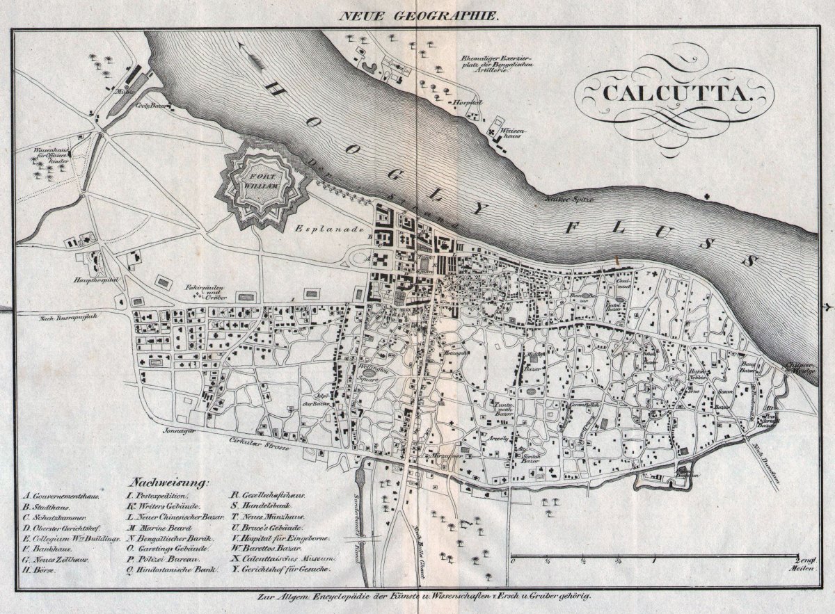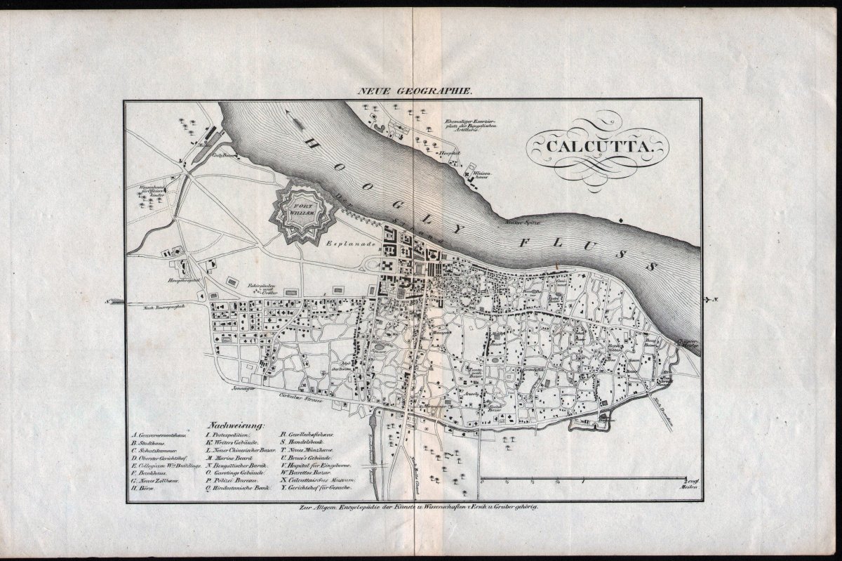 Ein Stadtplan von Kalkutta, Original-Kupferstich um 1830. Aus der Allgemeinen Enzyklopädie der Wissenschaften und Künste" von Ersch und Gruber, die 1818 - 1869 erschien. Plangrösse (ohne Schrift oben und unten): 18,9 x 27 cm, Blattgrösse: 25,7 x 39,5 cm. Mittelfalte wie üblich, etwas wellig, kaum fleckiges, sehr gut erhaltenes Exemplar. Schöner Plan! Original, kein Nachdruck, für die Echtheit wird garantiert!
