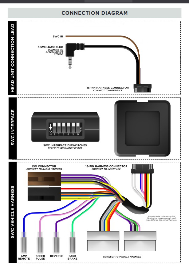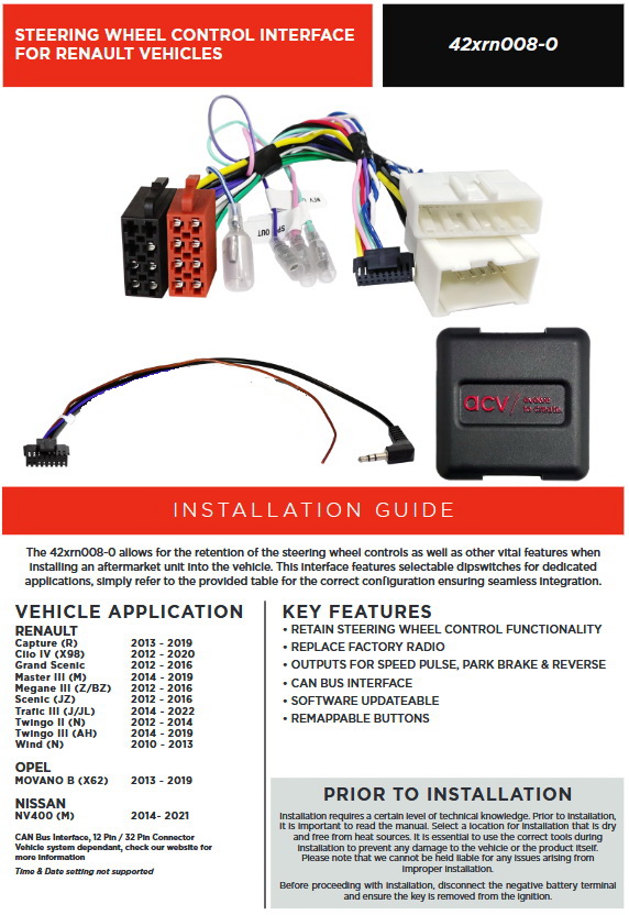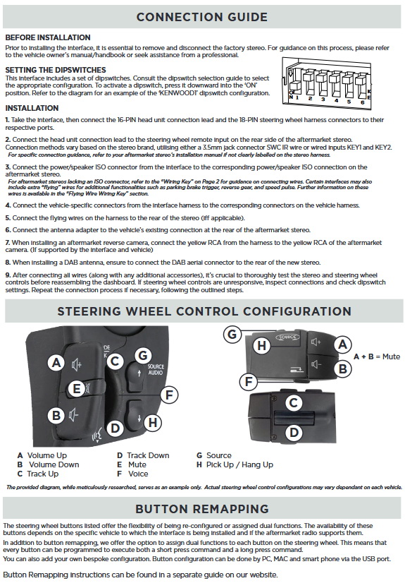 - Lenkradbefehle (Anschlusskabel für Alpine, Clarion, JVC, Kenwood, Pioneer, Sony, Xzent und Zenec.