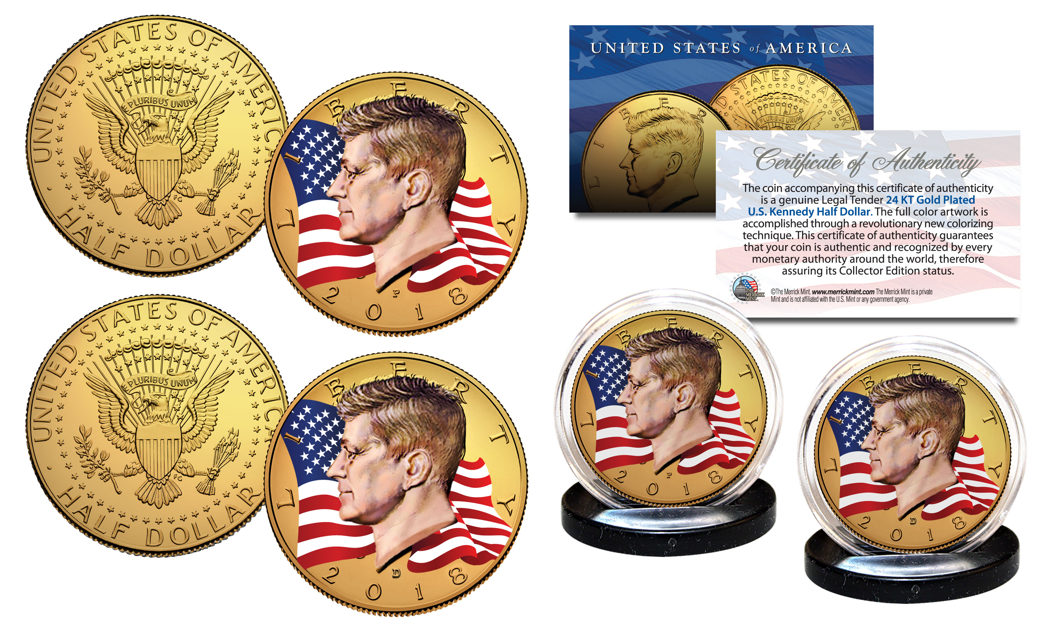 Here is your chance to own this beautifully colorized and 24K Gold Plated Flowing Flag JFK Kennedy Half Dollar U.S. 2-Coin Set which includes both Philadelphia and Denver Mintage. Each coin, which has been layered in Genuine 24 Karat Gold, is beautifully enhanced in permanent full-color by the Merrick Mint to highlight the original obverse design using a unique colorizing process, which involves the application of special inks directly to the surface of a coin. The result is an everlasting colorized coin collectible of ultra-high quality that is #1 in the industry. These uncirculated legal tender U.S. coins are not in general circulation and are not available in any bank. Each coin features the left portrait of John F. Kennedy design on the obverse and a modified presidential seal design on the reverse.