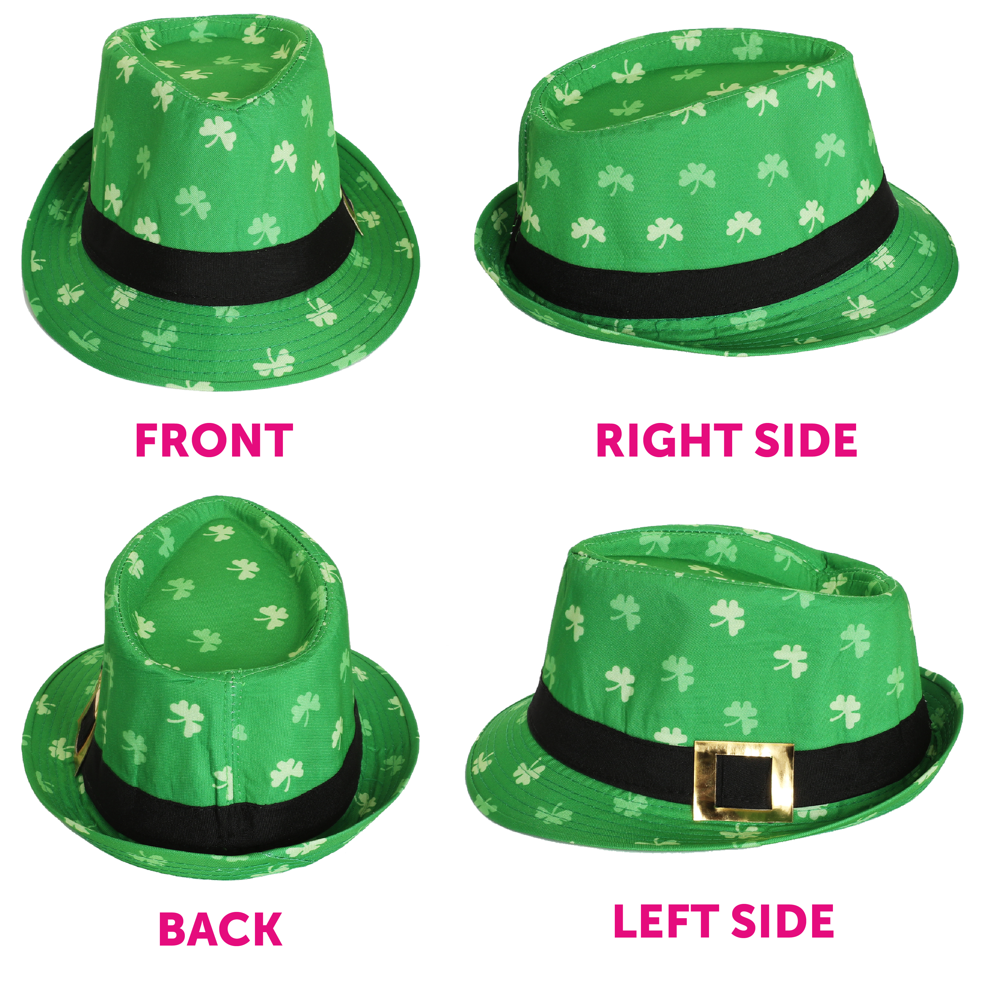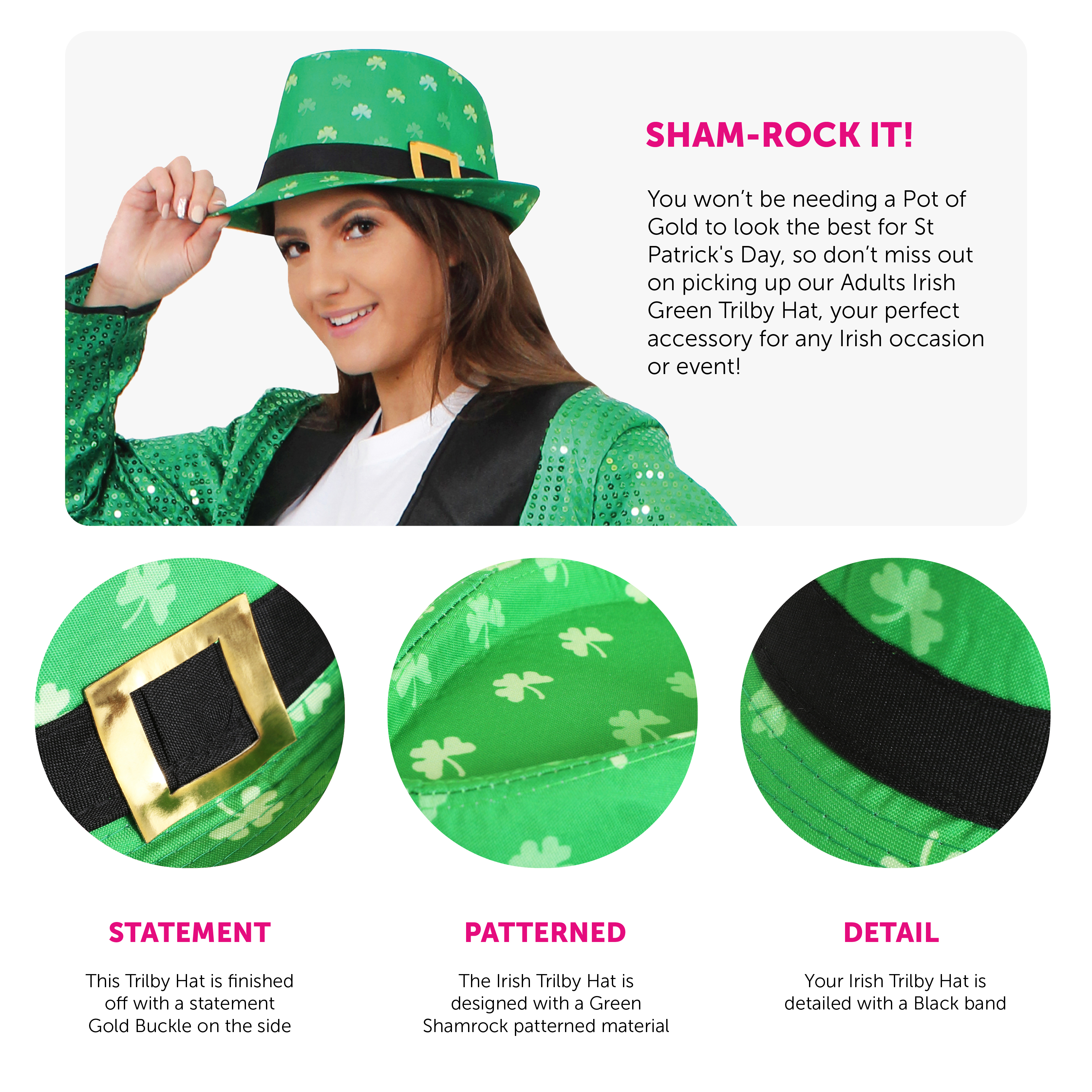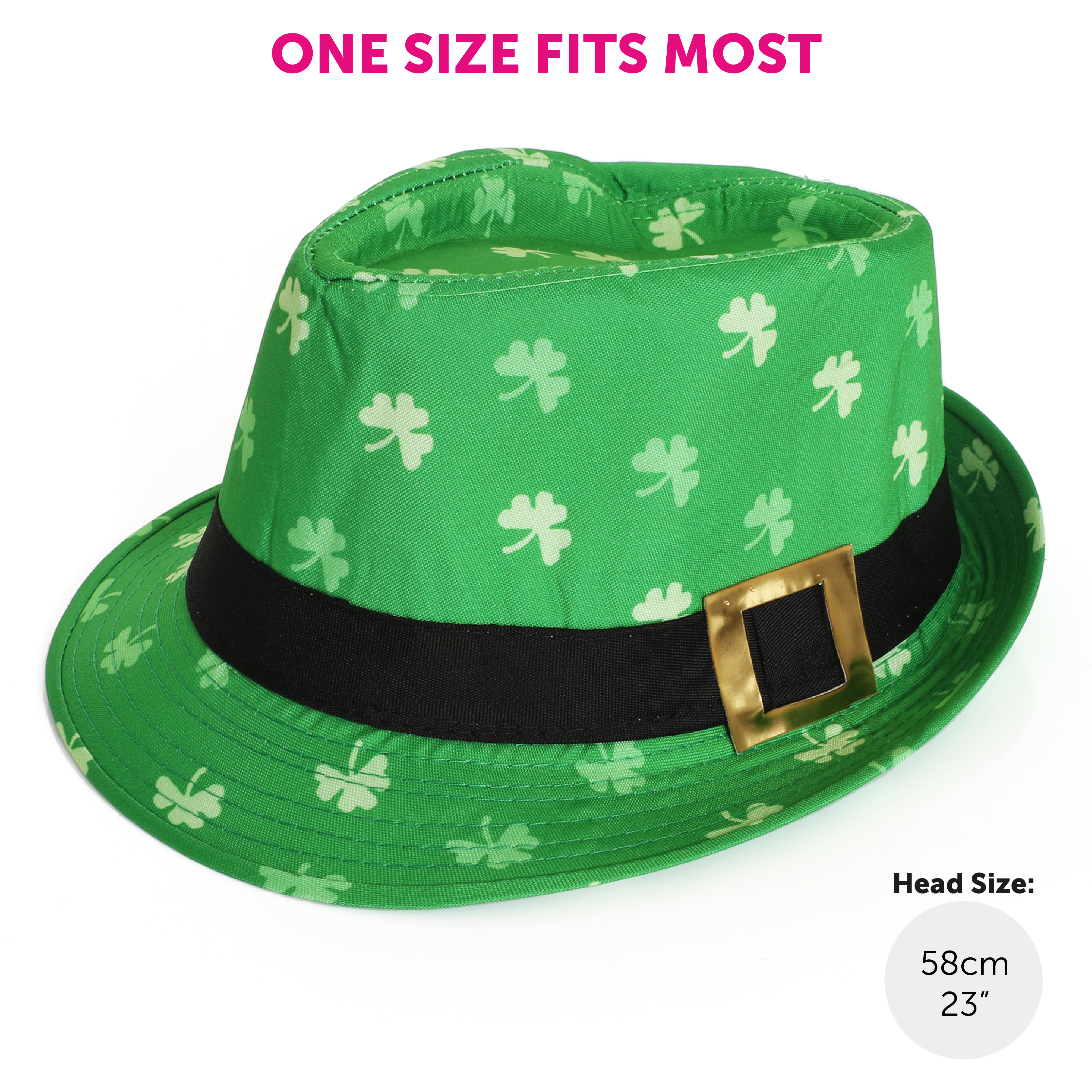 TRILBY HAT DETAILS: This Adults Irish Trilby Hat is a Green Trilby Hat covered in Shamrock print with a Black band and statement Gold Buckle, to finish off your outfit perfectly!
