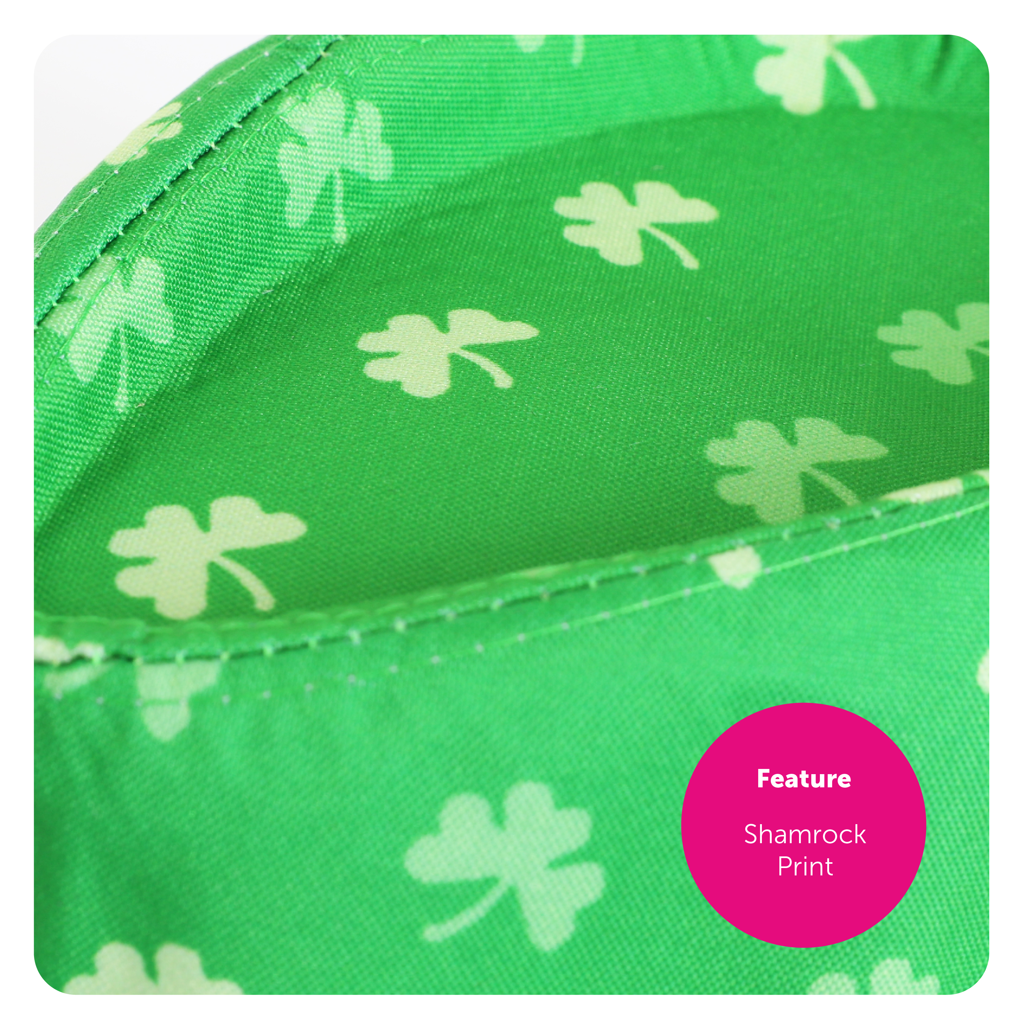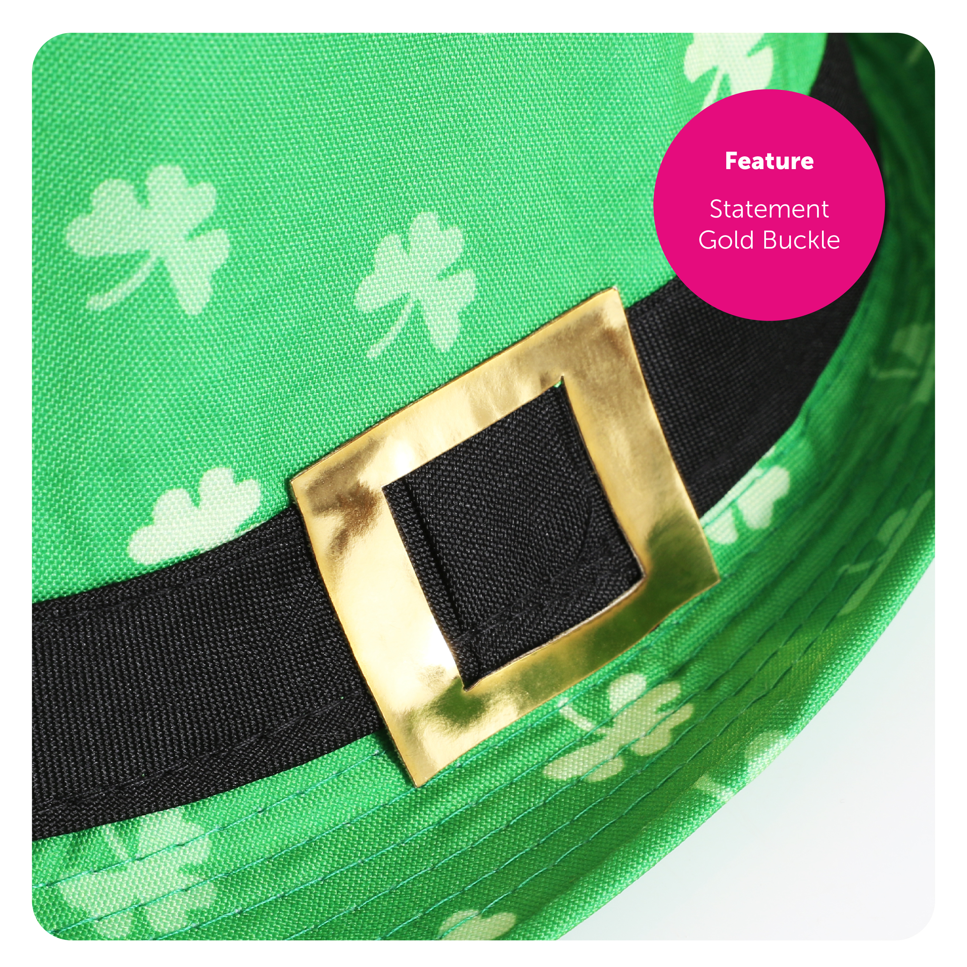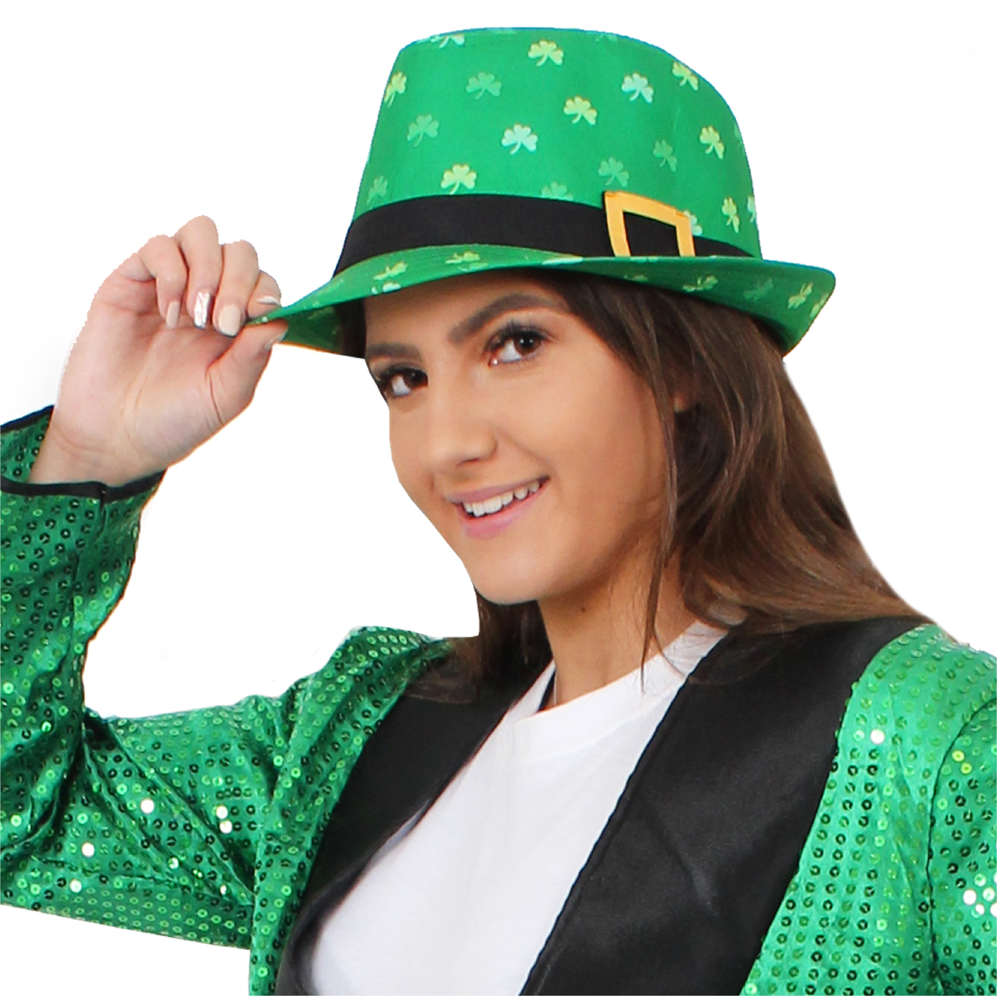 TRILBY HAT DETAILS: This Adults Irish Trilby Hat is a Green Trilby Hat covered in Shamrock print with a Black band and statement Gold Buckle, to finish off your outfit perfectly!