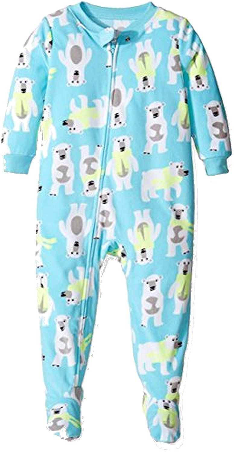 An ultra-soft and cozy fleece pajama sleeper. Turquoise blue ribbed trim. A super cute scarfed Polar Bear print throughout. Full front zipper and non-slip foot soles