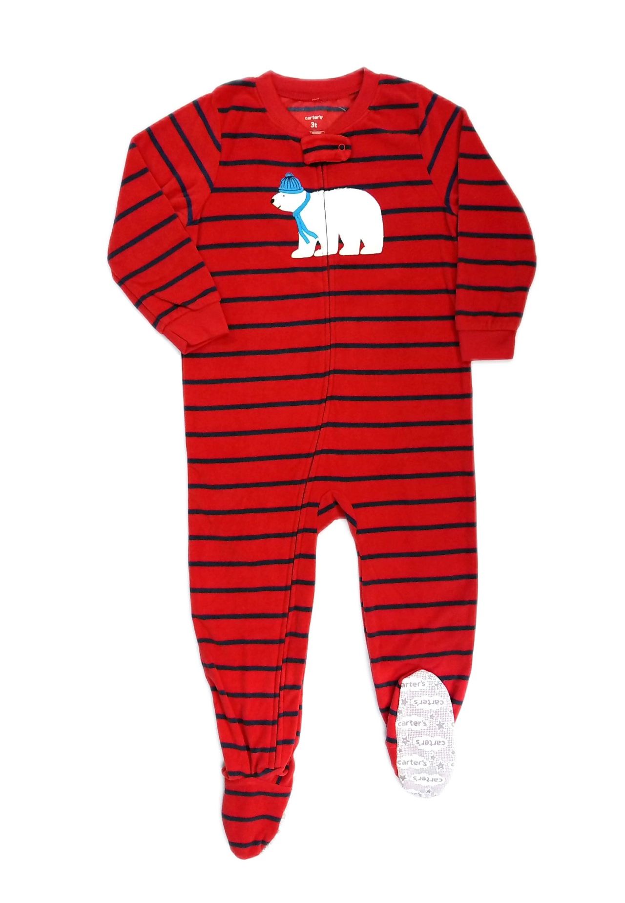 He'll stay warm and cozy this winter season in this Carter's blanket sleeper. Red with stripes of navy blue. A super cute Polar bear in soft fabric and embroidery. A full front zipper and zipper cover tab. Non-slip, textured foot soles. Of an ultra-soft and plush fleece, inside and out.