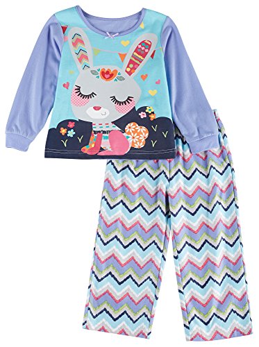 She'll love the cute graphics and comfort of this bunny themed pajama set. Features bright and colorful graphic with lilac purple trim and sleeves. A tiny satin bow adorns the rib-knit collar. Long-sleeved and of a soft polyester jersey fabric. Fun print pajama pants in a soft polyester flannel.