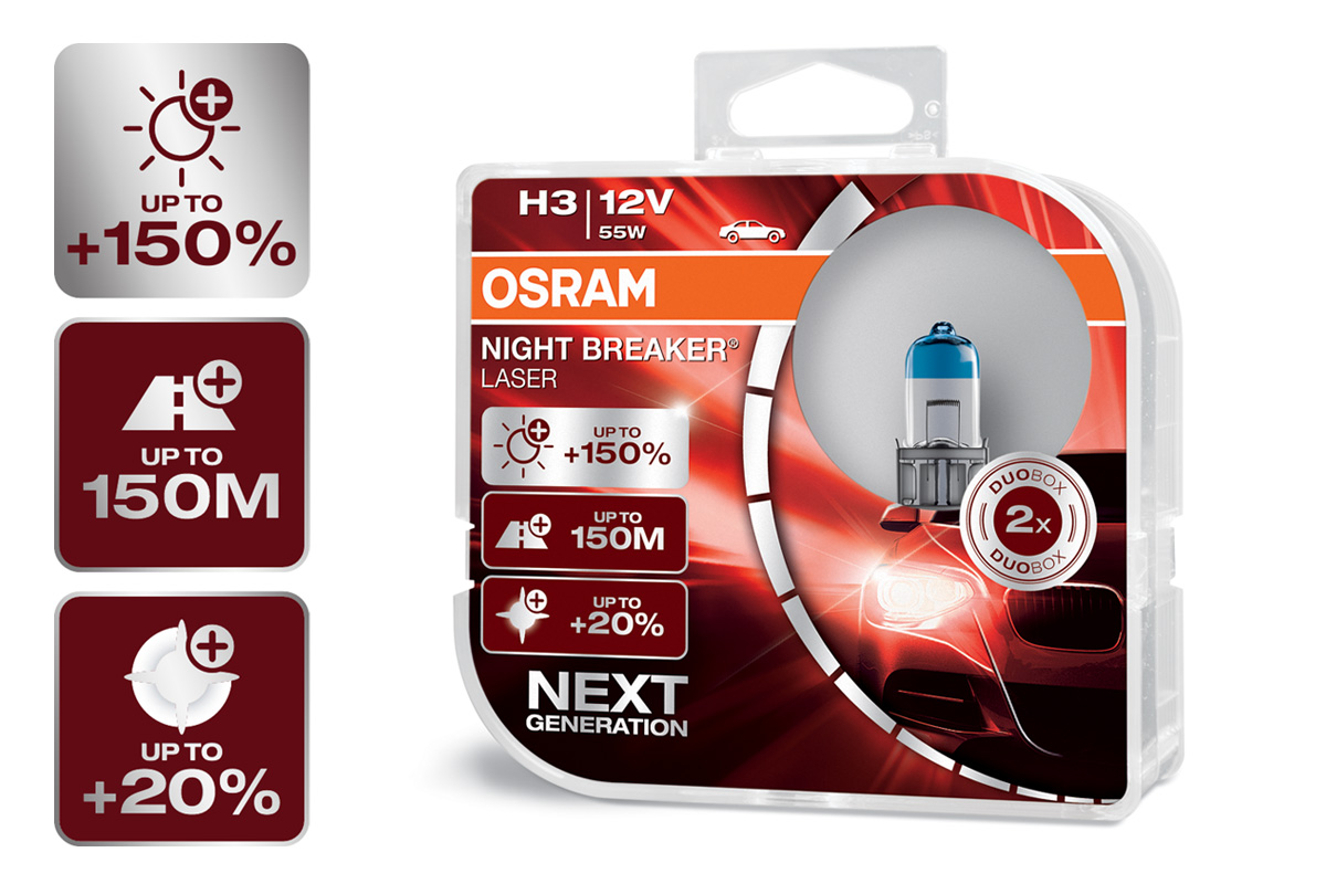 Alle OSRAM Fahrzeuglampen erfüllen die Qualitätsanforderungen der Automobilhersteller und liegen qualitativ sogar über den europäischen Normen. Das gilt natürlich auch für unsere neueste Innovation: OSRAM NIGHT BREAKER® LASER NEXT GENERATION. Ob Lichtstärke, Lichtkegel oder Lichtfarbe: Die neuen OSRAM NIGHT BREAKER® LASER NEXT GENERATION stoßen mit ihren Leistungswerten in neue Dimensionen vor – und setzen damit auch Maßstäbe bei Sicherheit, Komfort und Design. Unübertroffene Leuchtkraft hat einen neuen Namen: Mit bis zu 150 % mehr Licht und bs zu 150m weitere Sicht als Standardlampen stellt NIGHT BREAKER® LASER NEXT GENERATION dank innovativer Laserentschichtungs-Technologie alle anderen OSRAM Halogenlampen in den Schatten