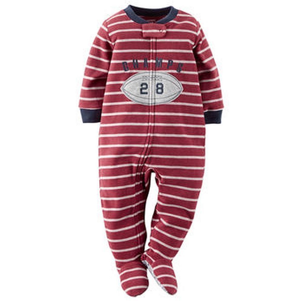 A super cute and comfy footed pajama sleeper In stripes with a football/champs theme in embroidery and fabric. Full front zipper, zipper snap tab cover Non-slip textured foot soles. Polyester