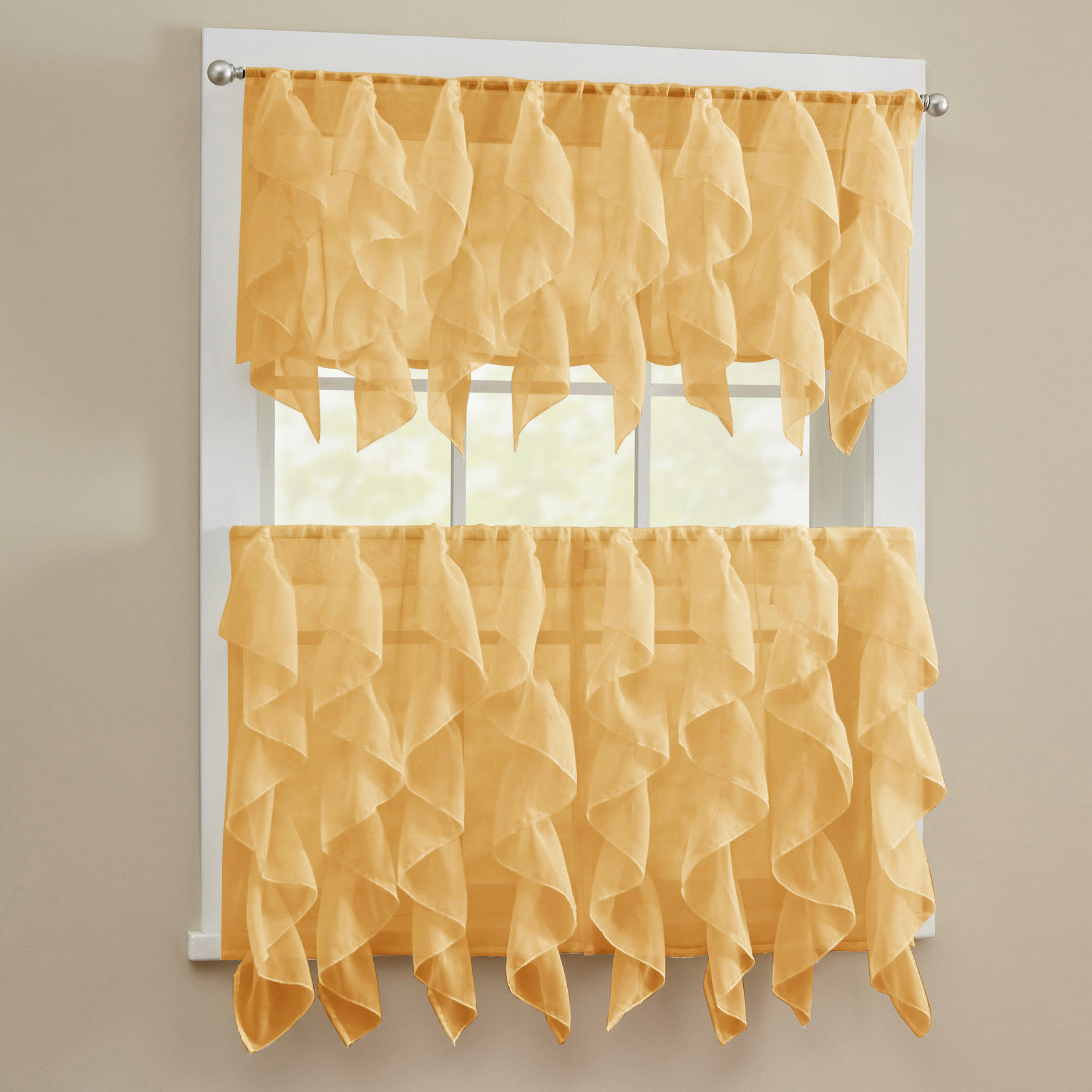 Add a touch of modern style to your home decor with these voile verticle ruffled tier Kitchen Window Curtain ensemble pieces. Featuring a vertical cascading ruffle pattern that offers a light filtering privacy and decorative shabby chic texture to your windows.