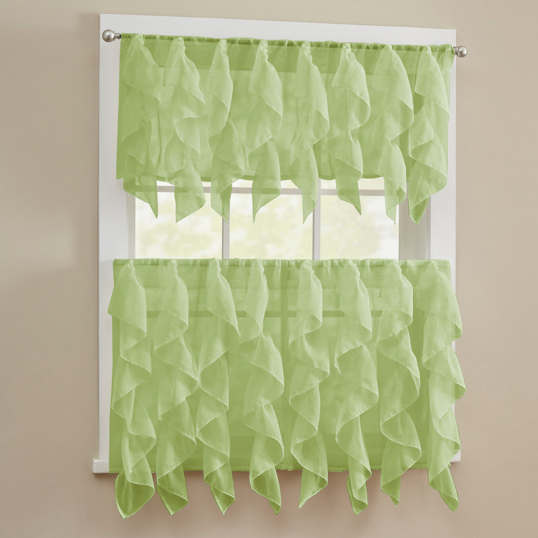 Add a touch of modern style to your home decor with these voile verticle ruffled tier Kitchen Window Curtain ensemble pieces. Featuring a vertical cascading ruffle pattern that offers a light filtering privacy and decorative shabby chic texture to your windows.