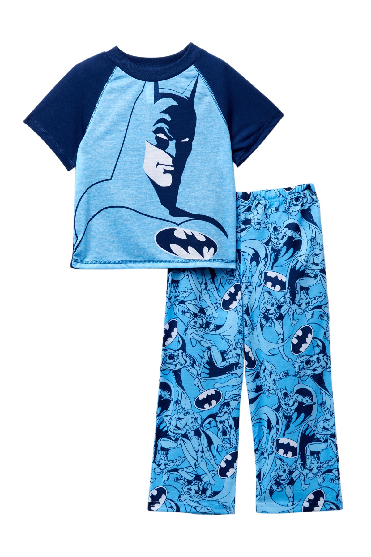 This flame-resistant pajama set has short sleeves and coordinating pj pants with repeating batman design.