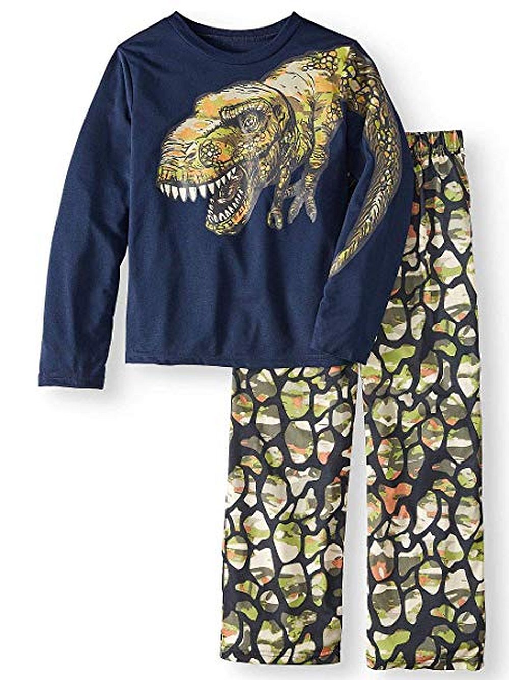 This pajama set is perfect for sleeping or just lounging around! Has a cool 3-D dinosaur, T-Rex graphic on the long-sleeved pajama top. Dinosaur print pajama pants with an elastic waistband for a custom fit. Both top and bottom are of a soft and cozy polyester jersey fabric.