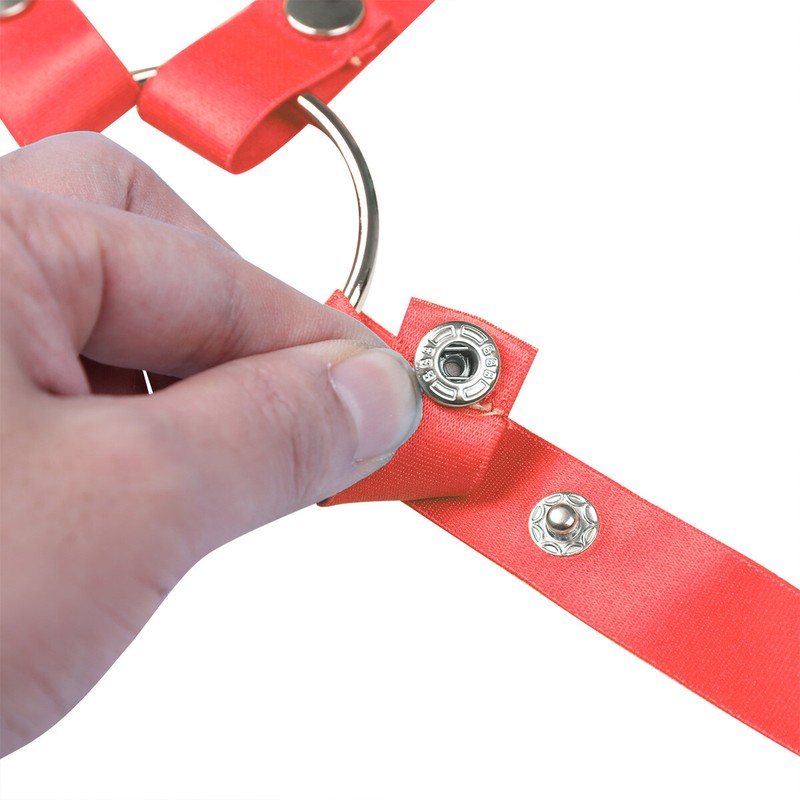 The adjustable strap connected by 4 steel O-rings and several snap buttons.