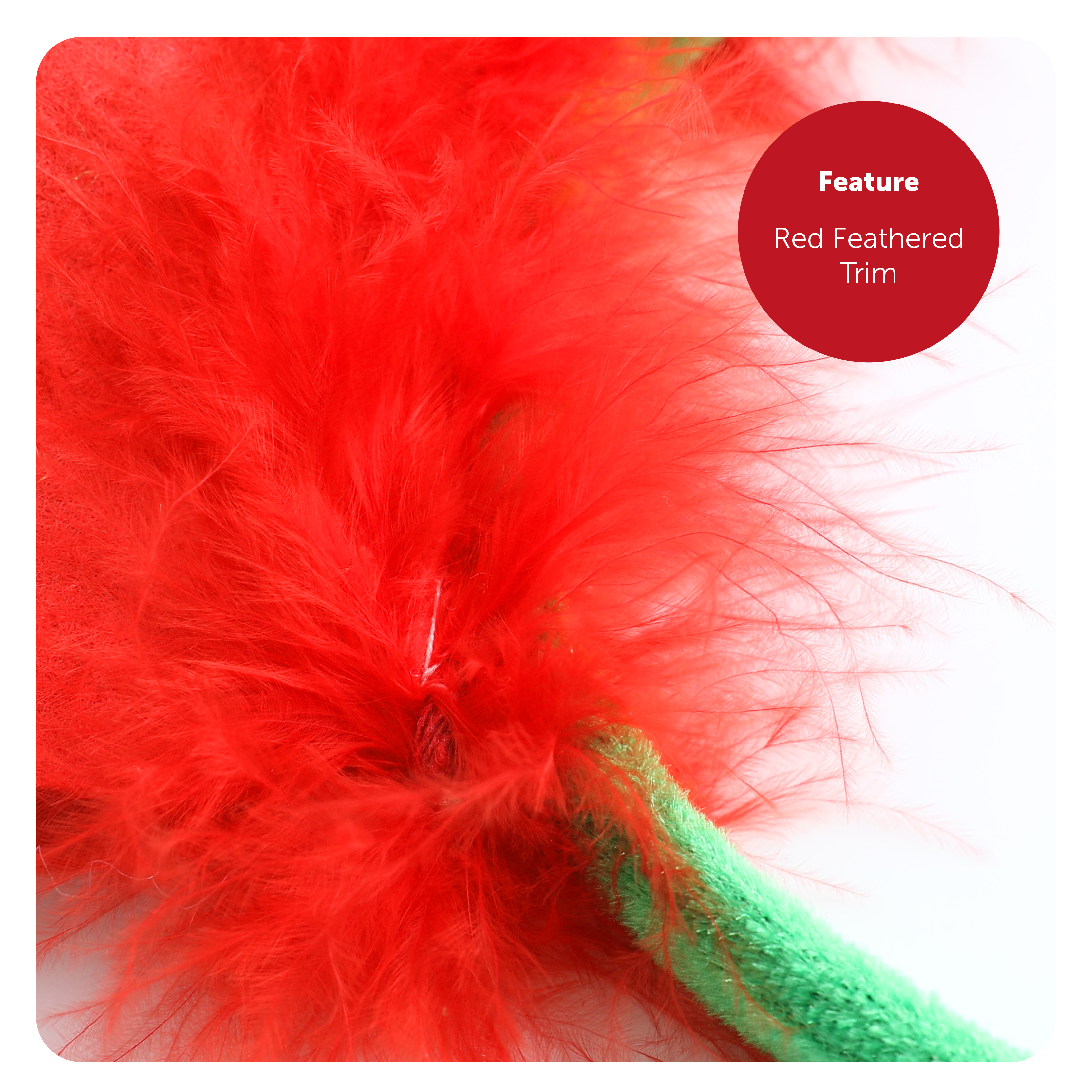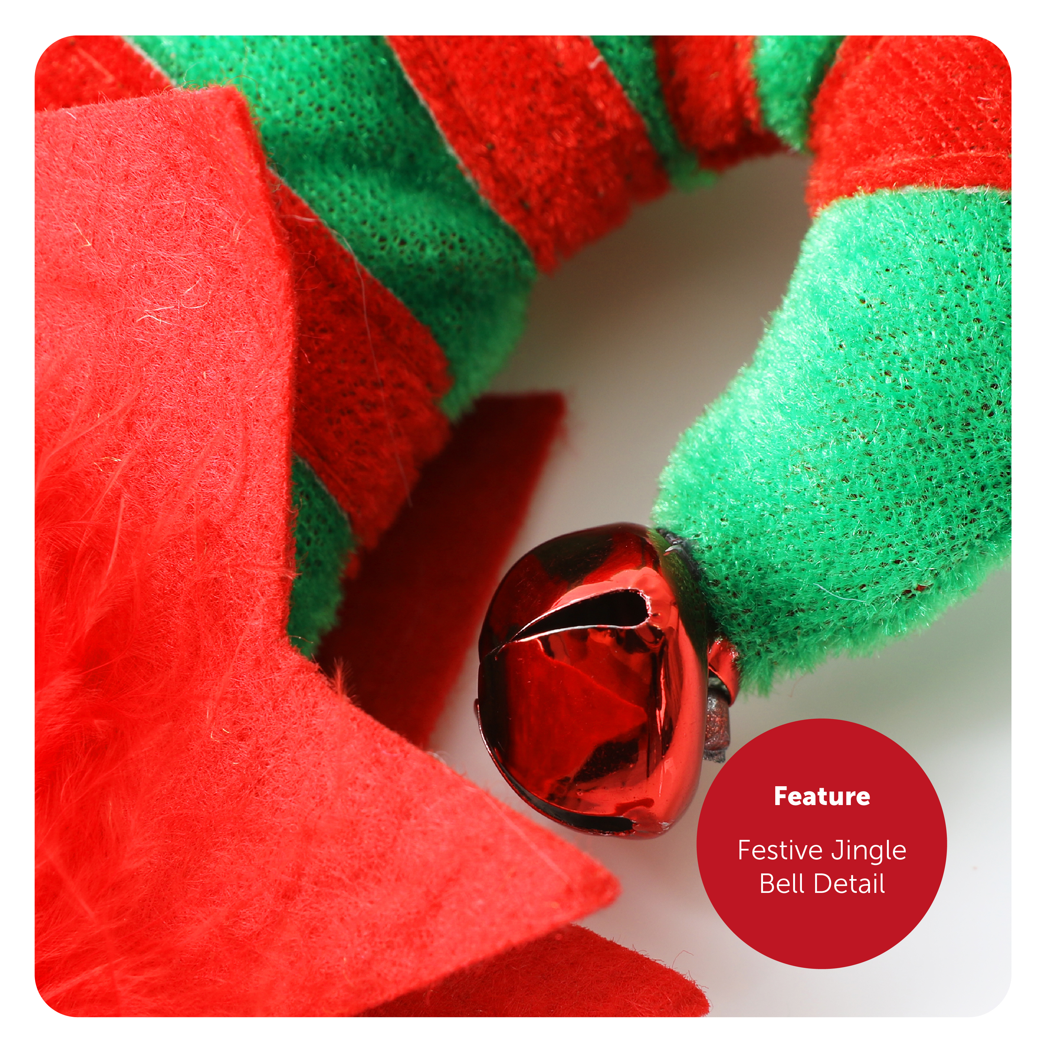 MINI ELF HAT DETAILS: Your Mini Elf Hat has a Green and Red Striped design with a curved tip with a small bell, at the base is a fluffy red crown with a red crown detail, all of this sits firmly on top of your headband!