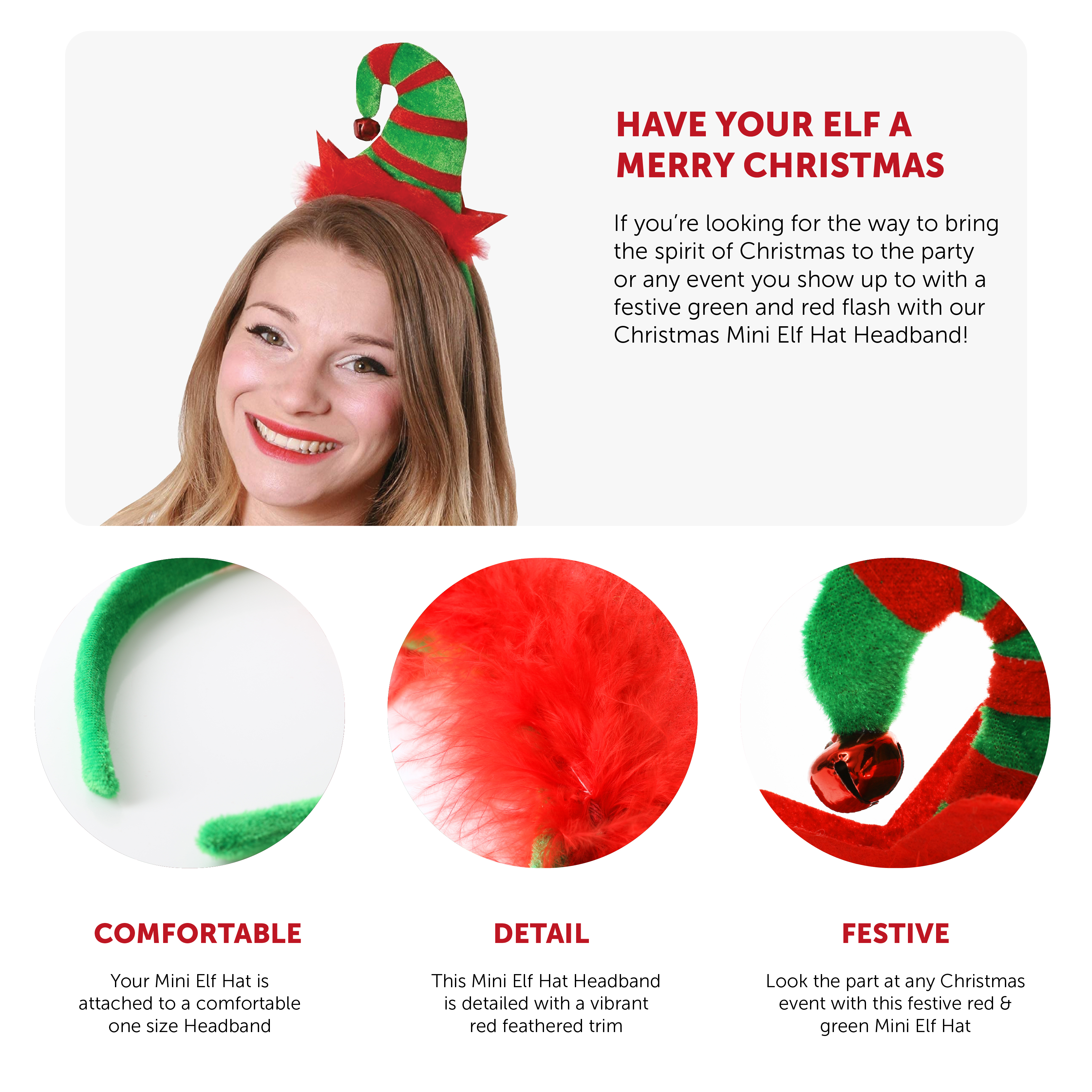 MINI ELF HAT HEADBAND: If you’re looking for the way to bring the spirit of Christmas to the party or any event you show up to with a festive green and red flash with our Christmas Elf Hats! This cute Mini Elf Hat Headband will delight your friends and family!
