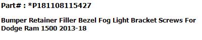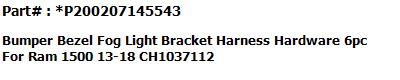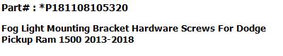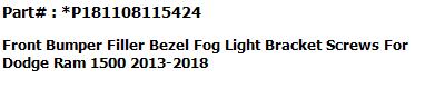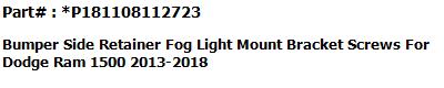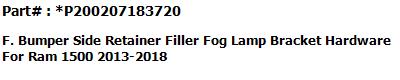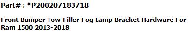 | This is a Brand New replacement parts for FOR DODGE PICKUP RAM 1500 2013-2018 (WITH 2 PIECE BUMPER) #1 FOG LAMP MOUNTING BRACKET LH=DRIVER SIDE (WITH HARDWARE) #2 FOG LAMP MOUNTING BRACKET RH=PASSENGER SIDE (WITH HARDWARE) *** DOES NOT FIT PLASTIC BUMPER. |