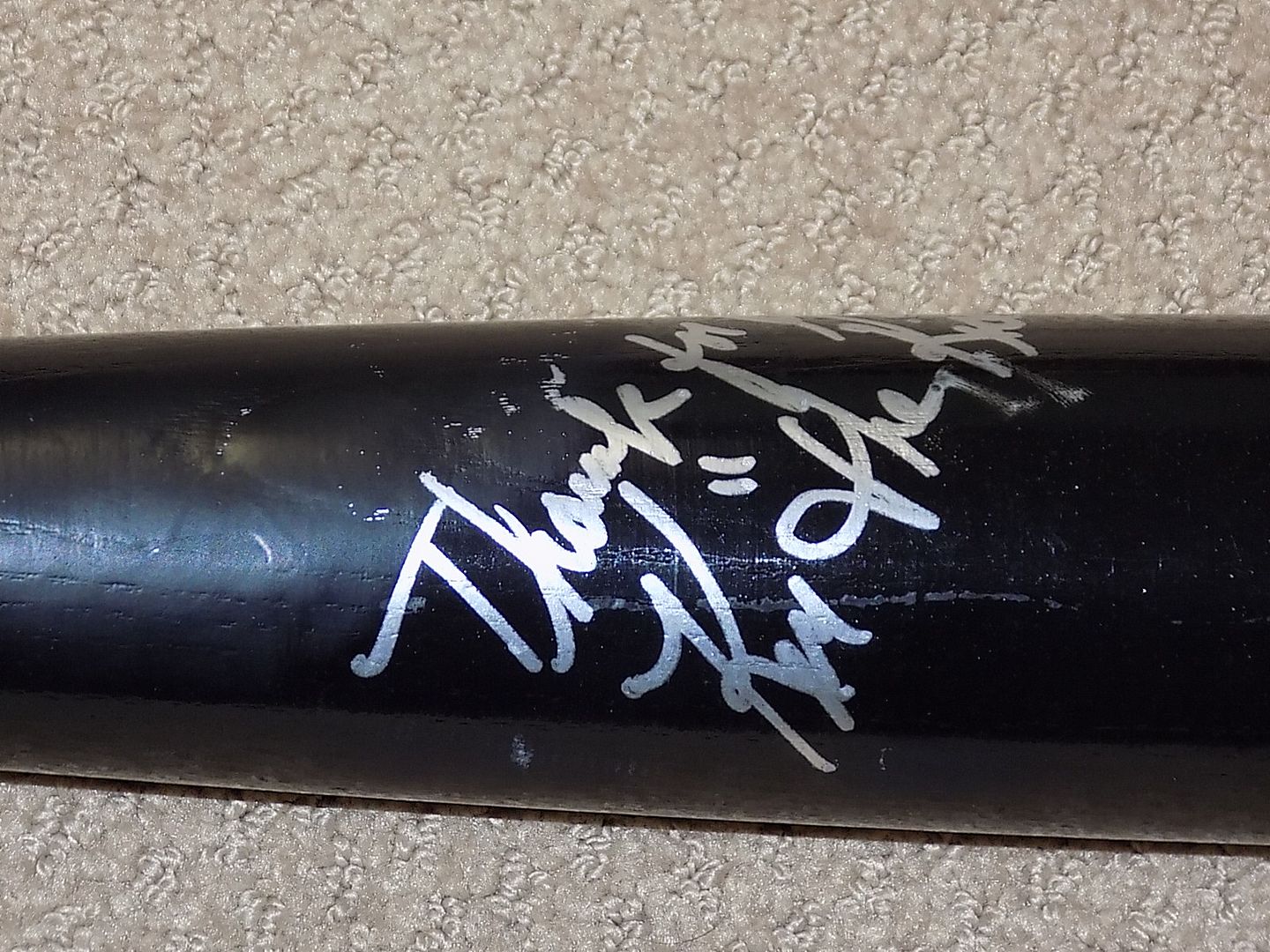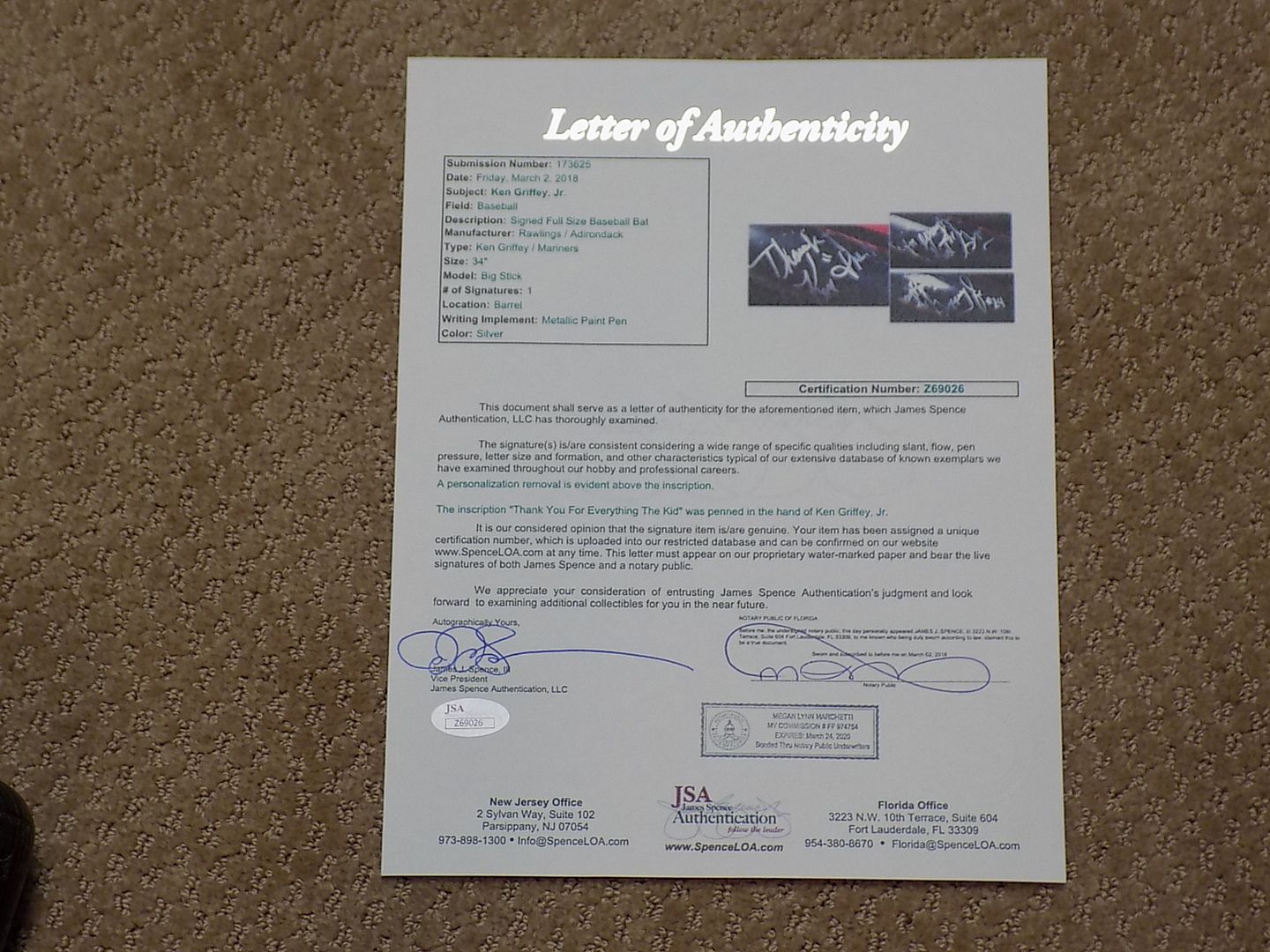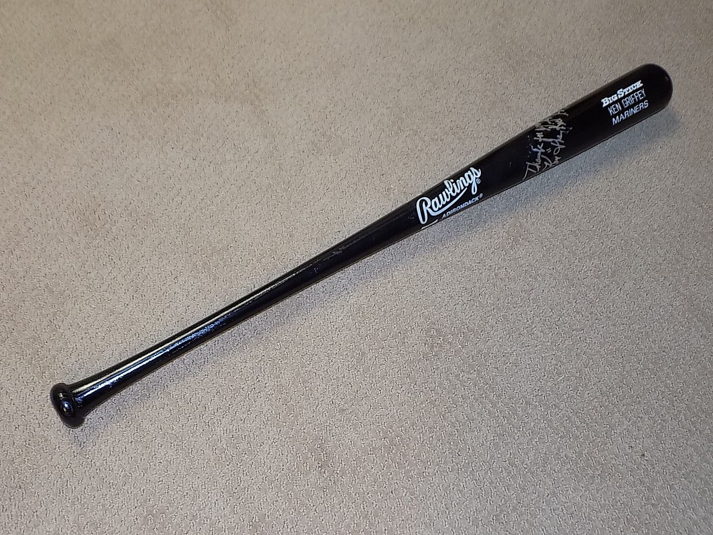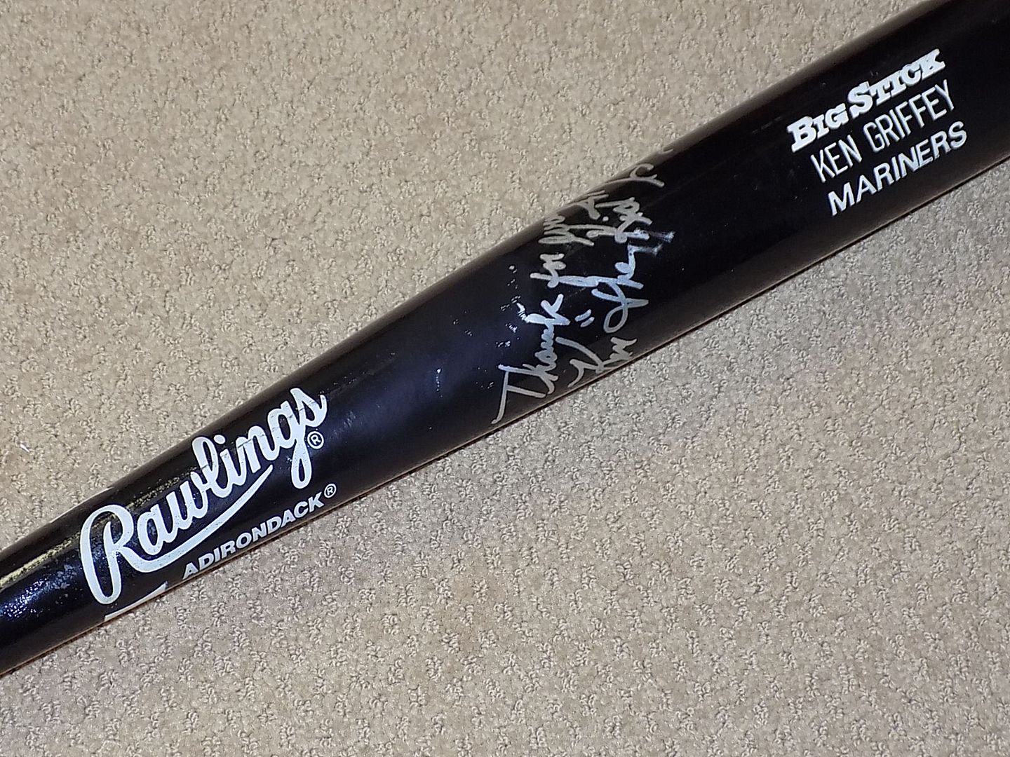 You are bidding on a Rawlings Adirondack baseball bat from 1990 that measures 34". Blocked letter model #460B. Bat is in excellent uncracked condition. Signed in silver on the barrel. Personalization above the autograph has been removed. JSA authentication #Z69026 for the autograph. Griffey Jr played for the Seattle Mariners and is a member of the National Baseball Hall of Fame. Shipping 20.00 to continental U.S. We now accept major credit cards and Paypal! Check my feedback.