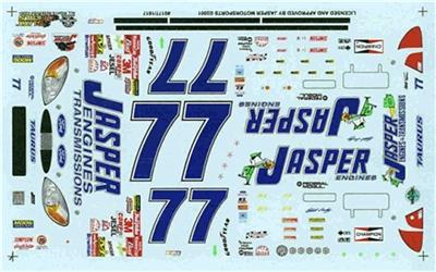 You are bidding on the Slixx #77 Jasper 2001 Nascar decal.All our decals are 1/24, 1/25 unless noted otherwise. Buyer pays $6.50 s&h  and we desire that items be paid for within 10 days of auctions end.   Payment is accepted via Pay Pal, Master Card/ Visa/ Discover.  Bidders outside of US welcome.Win other auctions and we combine shipping for no additional fee, but to combine shipping  ALL ITEMS MUST BE PAID FOR IN ONE PAYMENT, NO EXCEPTIONS.