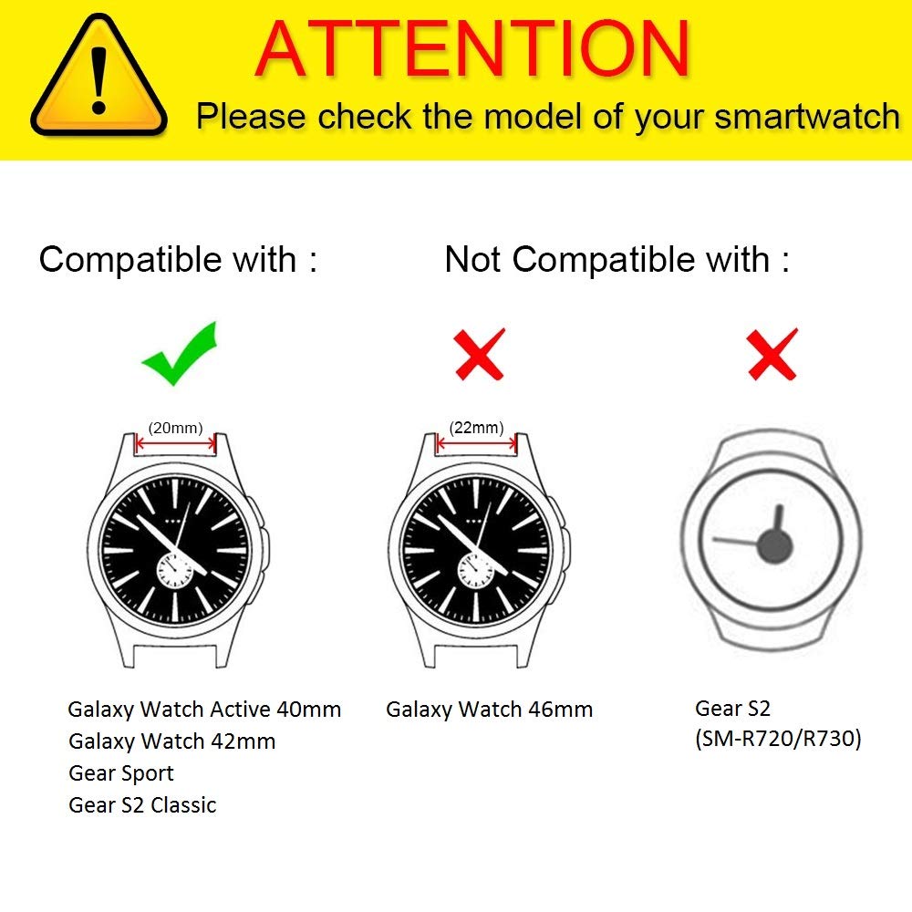 Compatibility: designed forSamsung New Galaxy Watch Active2 44mm, Galaxy Watch Active (40mm) (SM-R500), Galaxy Watch 42mm (SM-R810 / SM-R815), Gear Sport (SM-R600), Gear S2 Classic (SM-R732 / SM-R735) Smart Watch and any 20mm width lug watches. NOT FIT Gear S2 (SM-R720 / SM-R730).