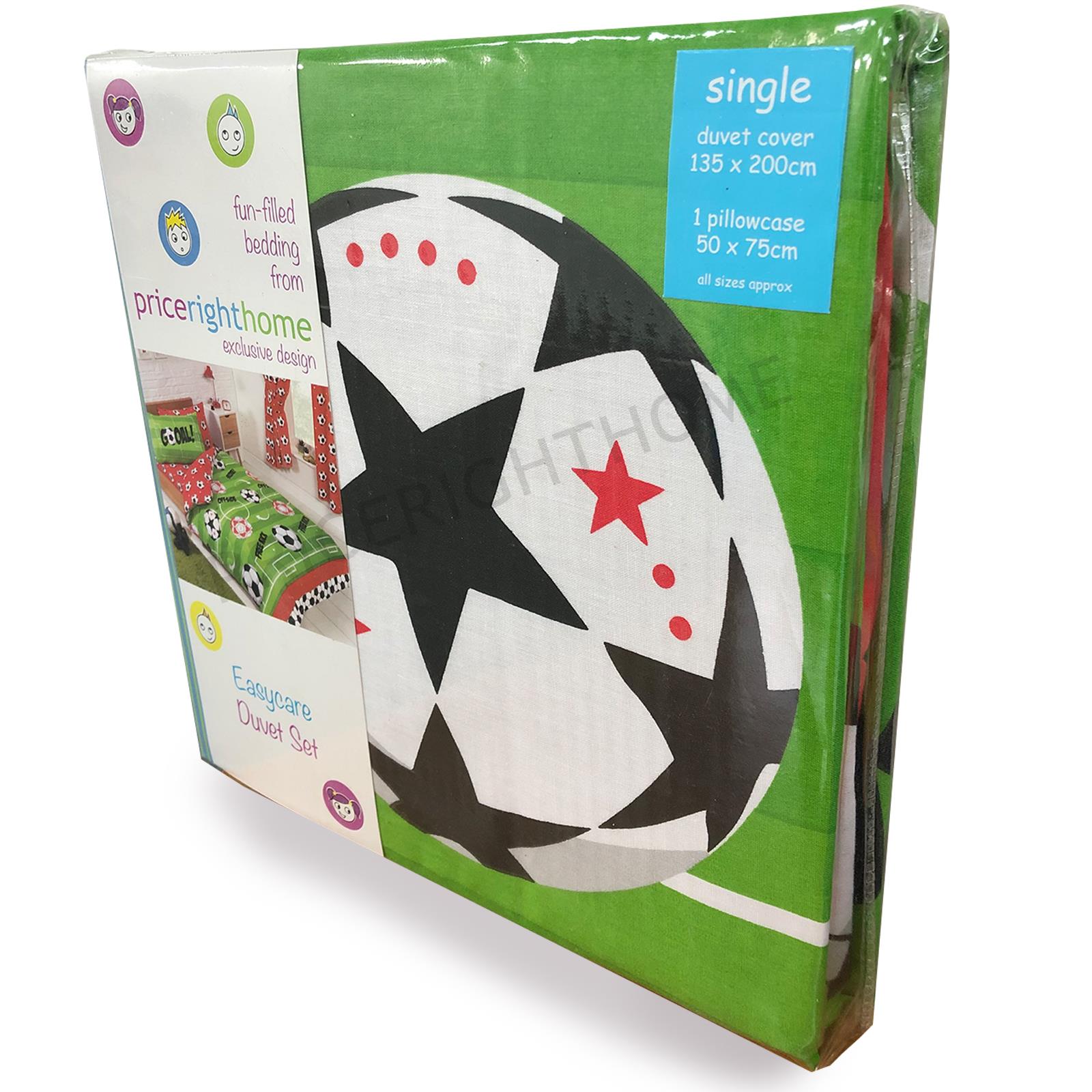 This Football Red Single Duvet Cover and Pillowcase Set is an ideal way to add a fun football theme to any footie mad little one's bedroom. The colourful design features large black, white and red footballs on a green football pitch themed backdrop, with footie related words such as Offside and Score! The reverse has a coordinating design of smaller black and white footballs on a red background. Made from Easycare material, the polycotton bedding set can be machine washed and tumble dried on a low setting. To complete the look, why not add the coordinating fitted sheet and curtains which are available in two drop lengths.