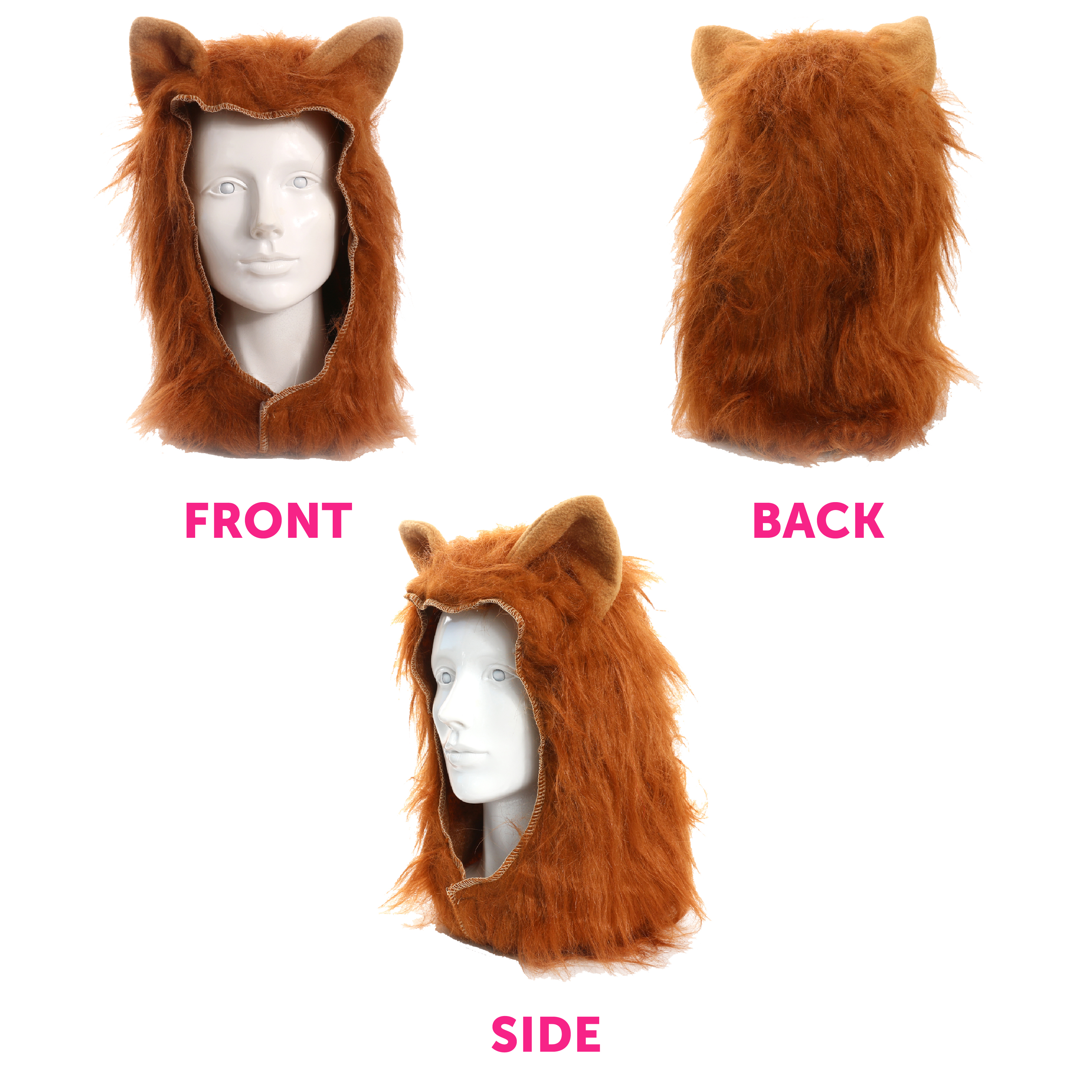 ADULTS LION HOOD DETAILS: Your Adults Lion Mane Hood Headpiece is a plush, brown, and furry headpiece, with a ‘Hook and Loop’ fastening system, making the mane a comfortable and easy to wear Hood to become the king of the jungle!