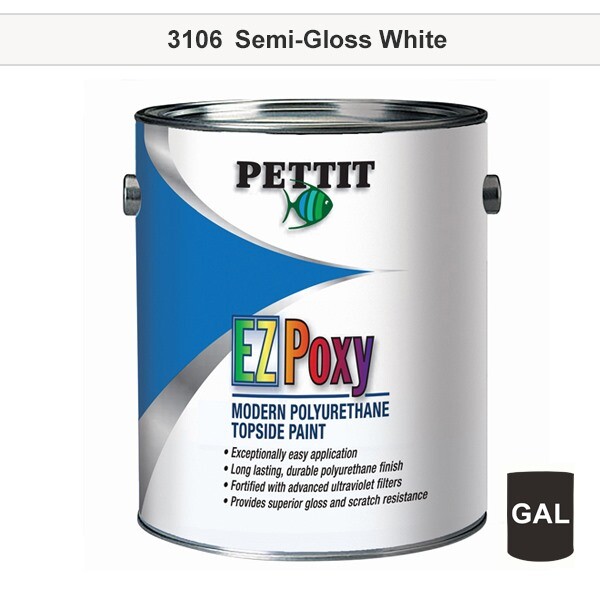 Pettit Easypoxy is a modern Polyurethane Paint that is easy to apply. One part application, long lasting, and provides fantastic gloss retention. Pettit EZ-Poxy is for topside and deck applications as it features a brilliant shine and user friendly brush-ability due to the addition of silicone. Pettit EZ-Poxy features a topside finish that’s exceptionally easy to apply, as it produces a gelcoat-like brilliance with minimum effort. Easypoxy also features advanced ultraviolet filters that enhance its superior gloss retention and durability. EZ-Poxy is economical, forgiving, and requires less effort. Eeasypoxy is available in white and twenty-five popular topside colors. Easypoxy provides exception finish for novice or expert painters with reccomended roll and tip method.