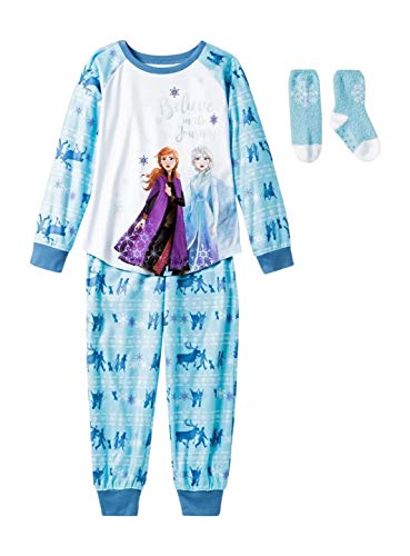 It's Anna and Elsa in a comfy pajama set she'll be sure to love. Features a pretty and colorful front graphic with slate blue collar trim and long print sleeves. Coordinating print pajama pants with an elasticized waistband for a custom fit. Constructed of ultra-soft flannel fabric, polyester. Includes a pair of soft and plush fleece socks with textured foot soles.