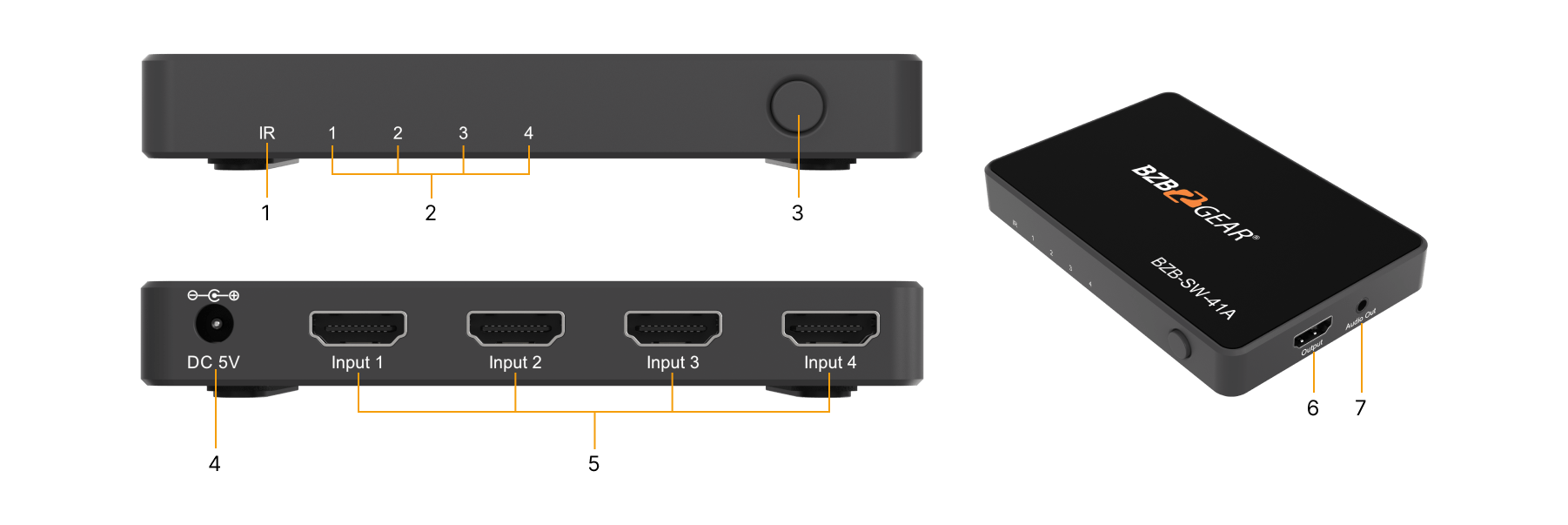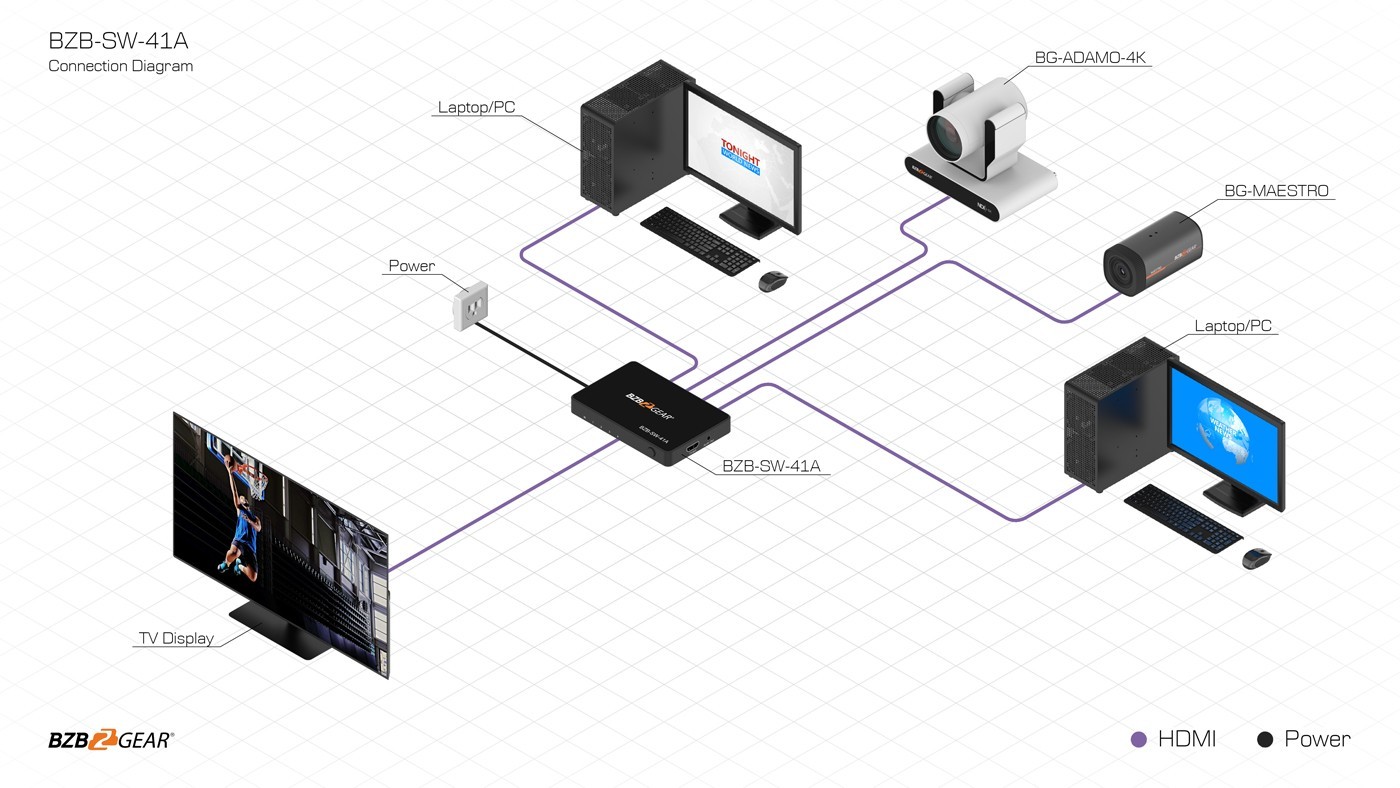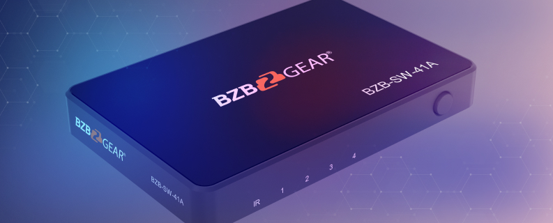 Switching between sources is simple when using the front panel push button or the IR remote, and its compact design makes installation easy. The BZB-SW-41A also supports automatic switching when a new source is connected, or to the last connected source when a source is disconnected.