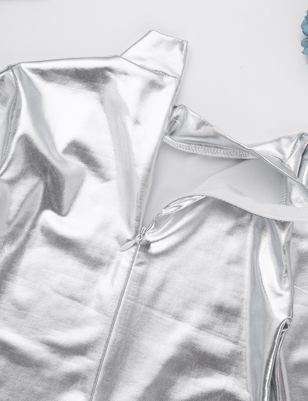 Long sleeves with thumb hole, turtleneck. Hidden back zipper closure. Glossy appearance, solid color.