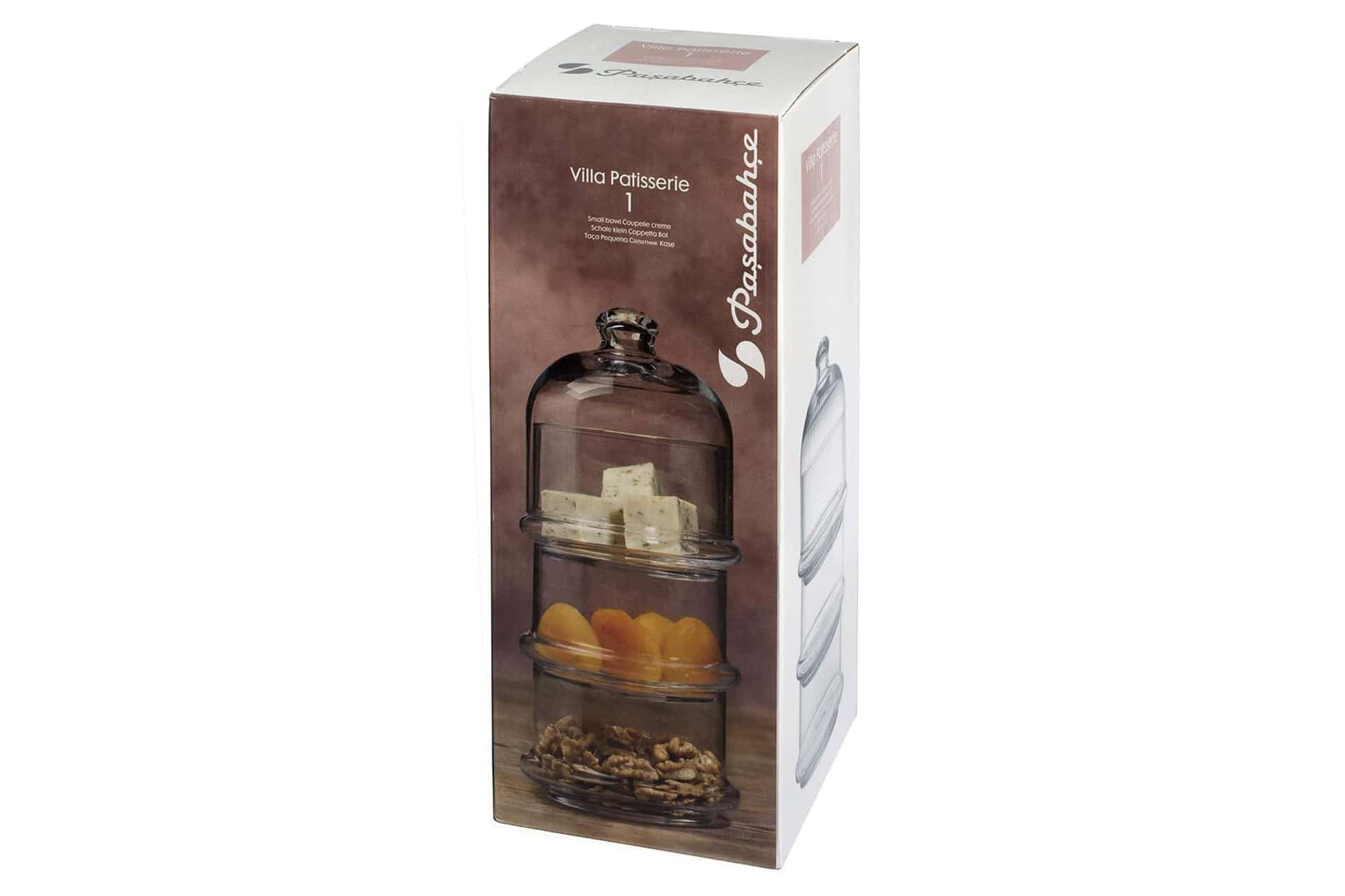 Torre impilabile in vetro trasparente di Pasabahce, composta da tre coppette sovrapponibili con campana. Ideale per presentare dolci, snack e antipasti in modo innovativo e salvaspazio. Realizzata in vetro lavabile in lavastoviglie, adatta al microonde e sicura per alimenti. Dimensioni: altezza 26 cm, diametro 11.8 cm. Perfetta per pasticcerie, ristoranti ed eventi speciali in hotel.