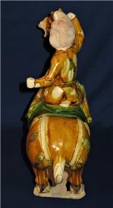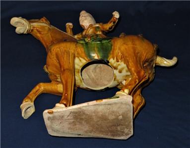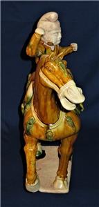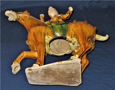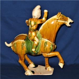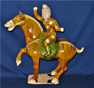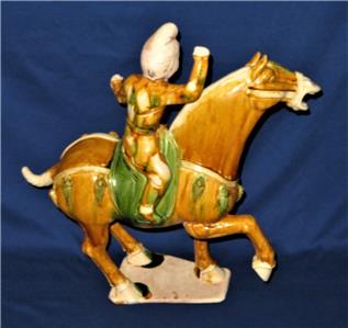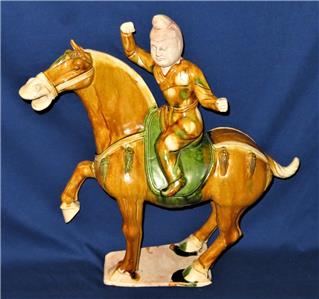 You have found the missing piece to your Chinese Art Collection! Here is a Vintage Tang Dynasty Style Warrior on a Horse. It features a Sancai Glaze of Green, Brown & Cream Colors. There is No Maker Marks, the Horse is Hollow, and the Base is Not Completely Flat. The statue is 18" high by 6" by 18" across, the base is 7" long by 3 1/4"-5" across. It is in very good vintage used condition based Wear to Sancai Glaze due to Weather & Age (see Pictures). Please see our Not Just China Store for more Fine Arts.