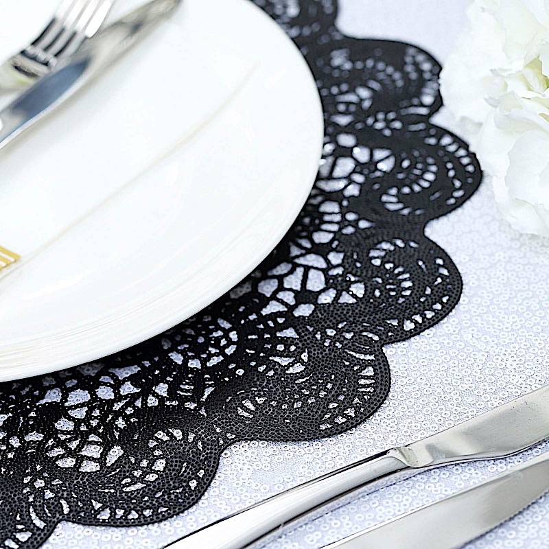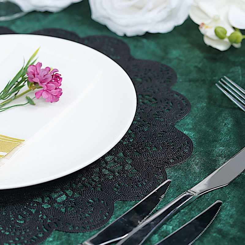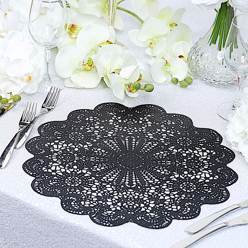 Featuring a floral lace design, these vinyl placemats offer a bright decorative accent to event tablescapes.