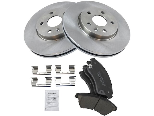 Package Contents: (1) Front Ceramic Brake Pad Set; (2) Front Replacement Brake Rotors; Brake Pad Contact Point Grease; Brake Pad Hardware